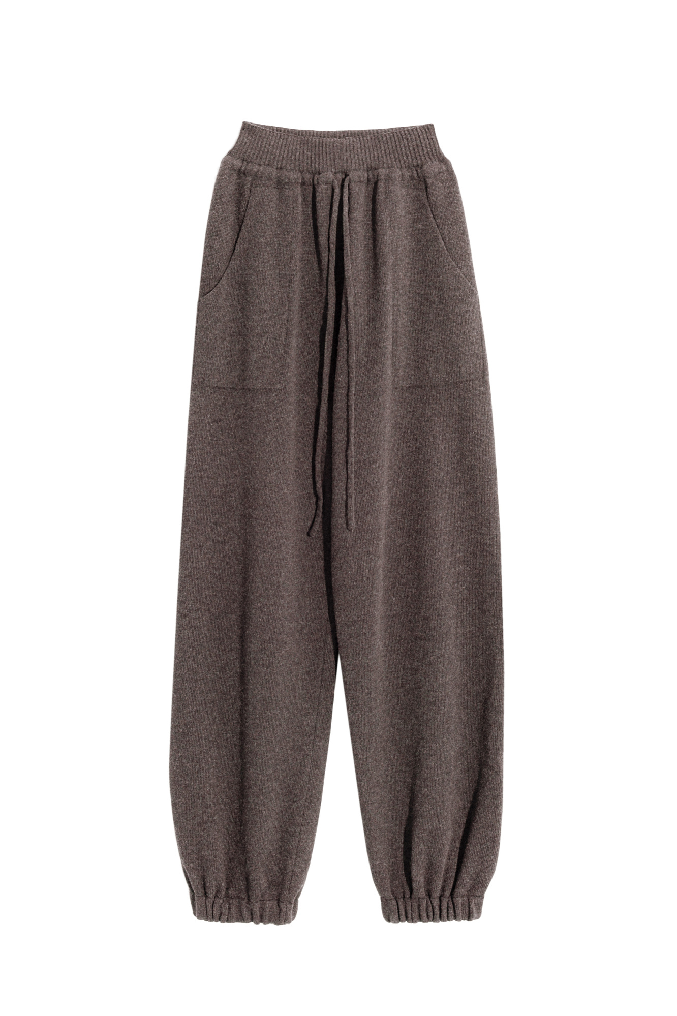Трикотажные брюки-бананы из кашемира и шерсти. Модель свободного силуэта, с эластичным поясом в рубчик, дополненным кулиской, и двумя большими карманами. Манжеты выполнены на резинках.