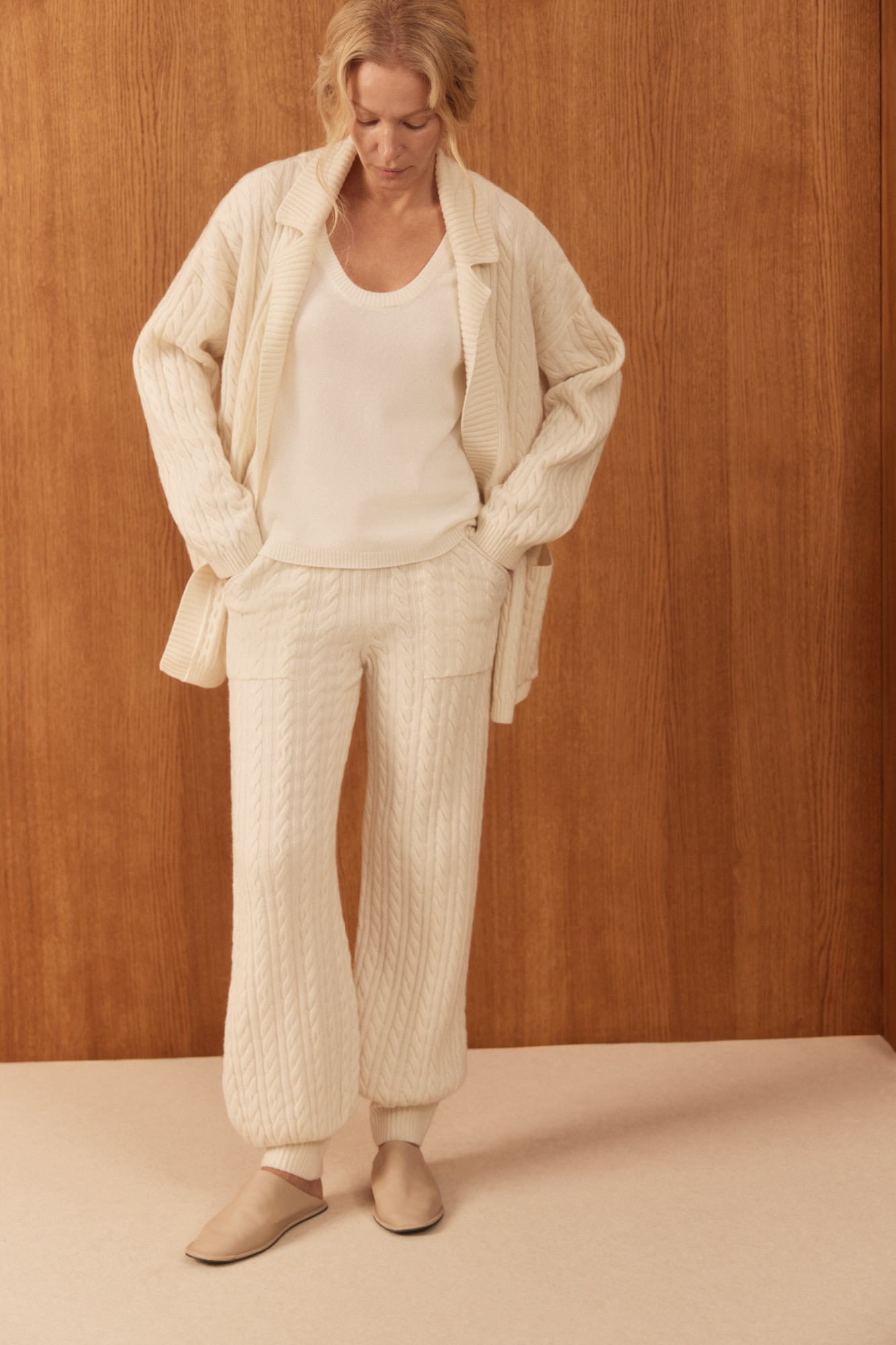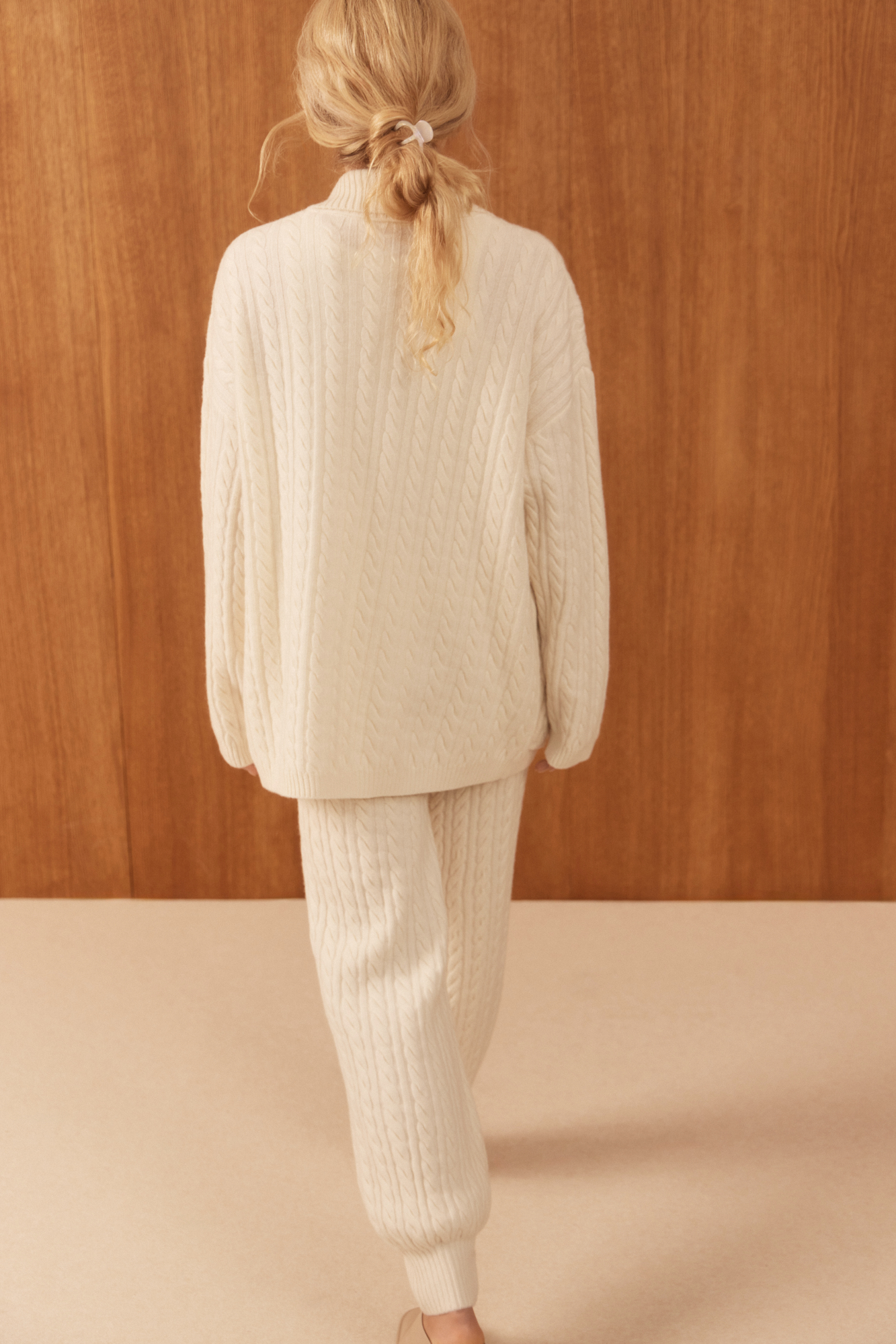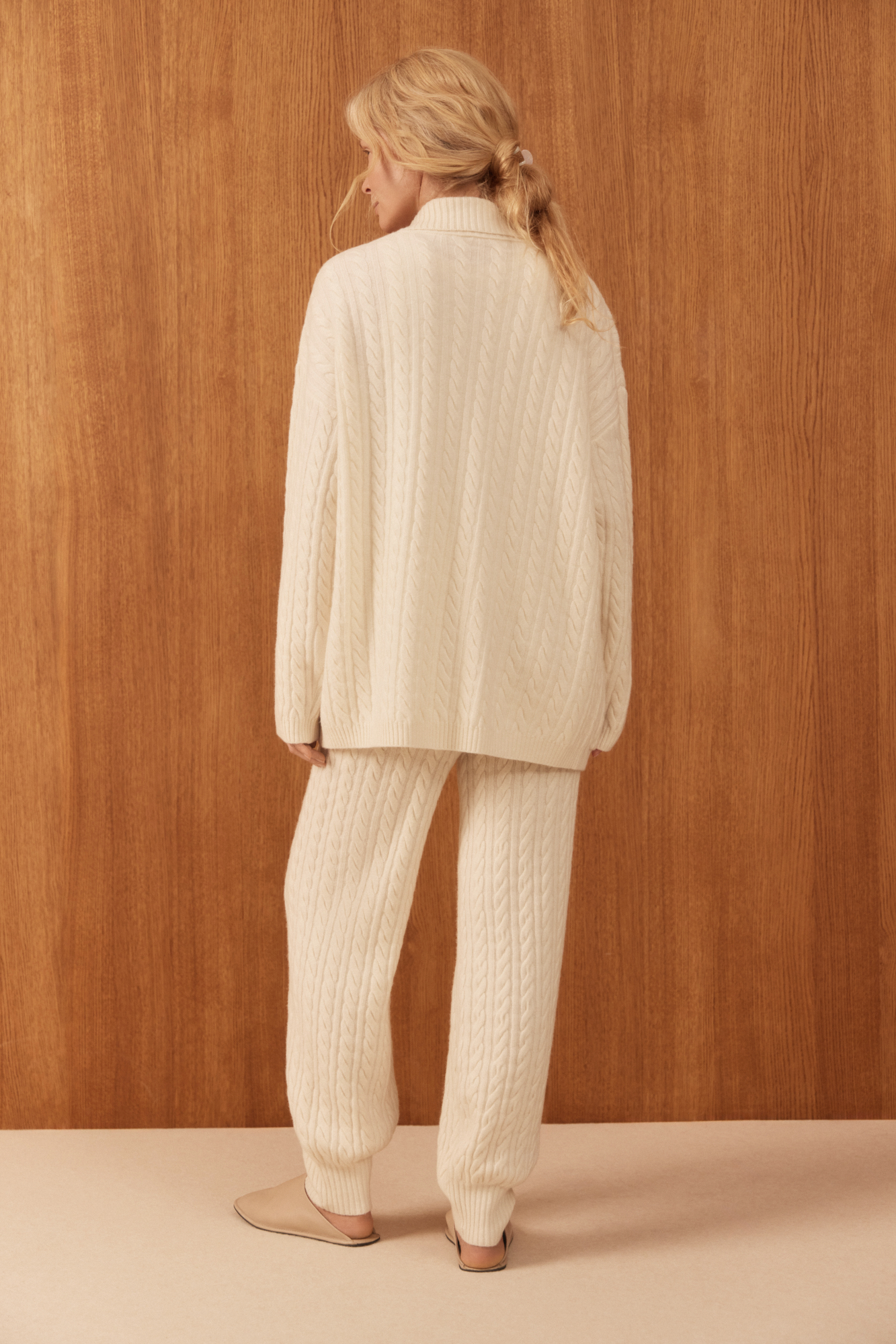 Трикотажные брюки-джоггеры из кашемира и шерсти с объемными косами. Модель с эластичным поясом, большими накладными карманами и манжетами в рубчик.