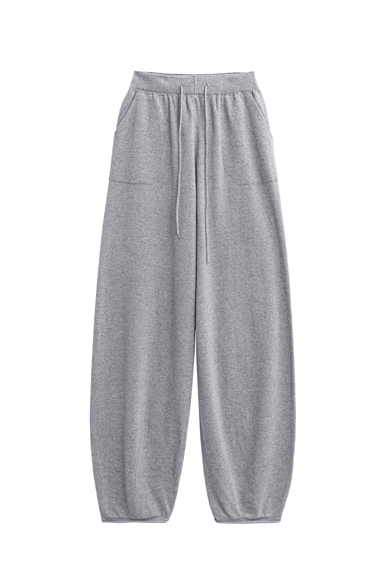 Трикотажные брюки-бананы из кашемира и шерсти. Модель с эластичным поясом, дополненным кулиской, большими накладными карманами и валиками-манжетами.
