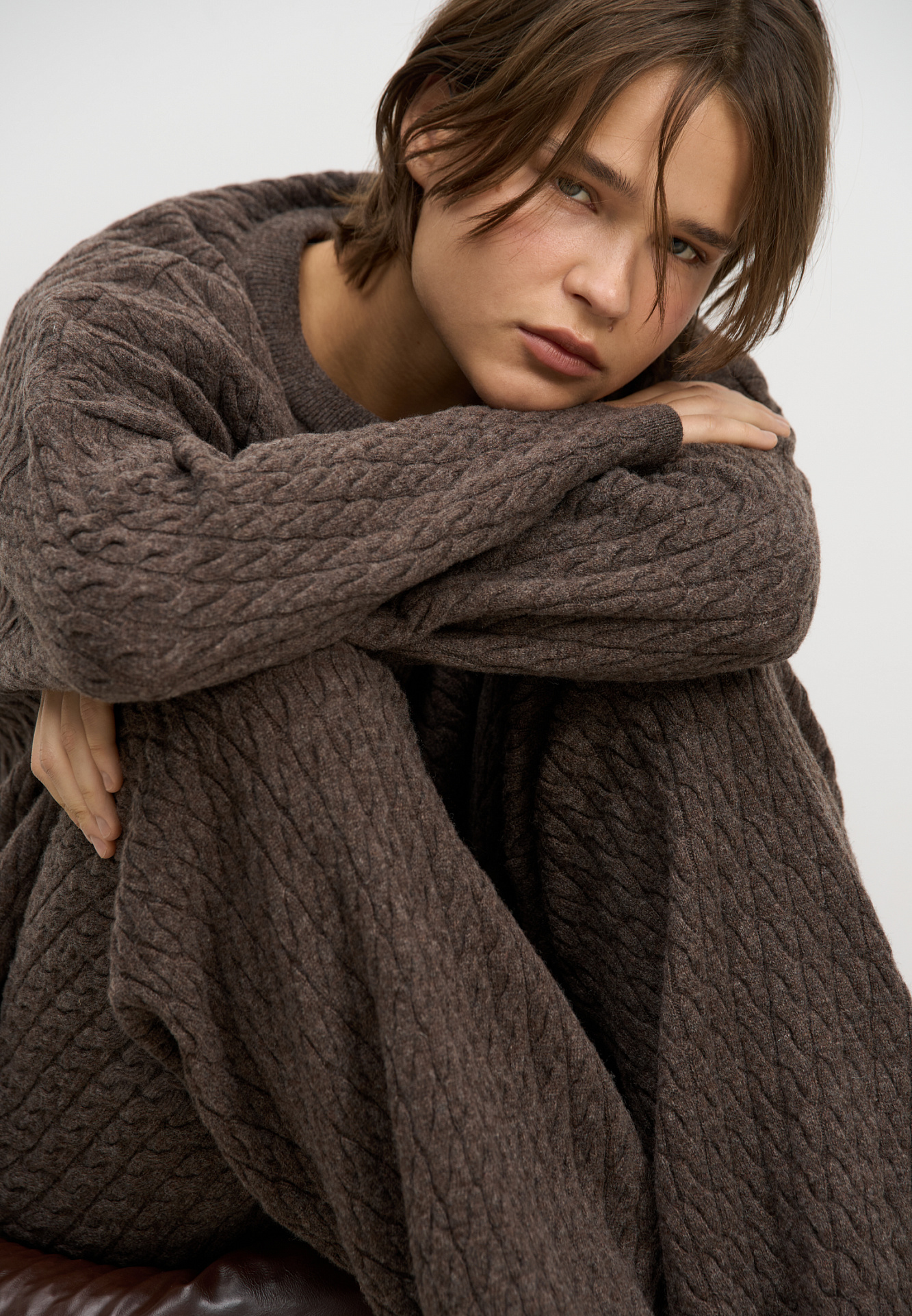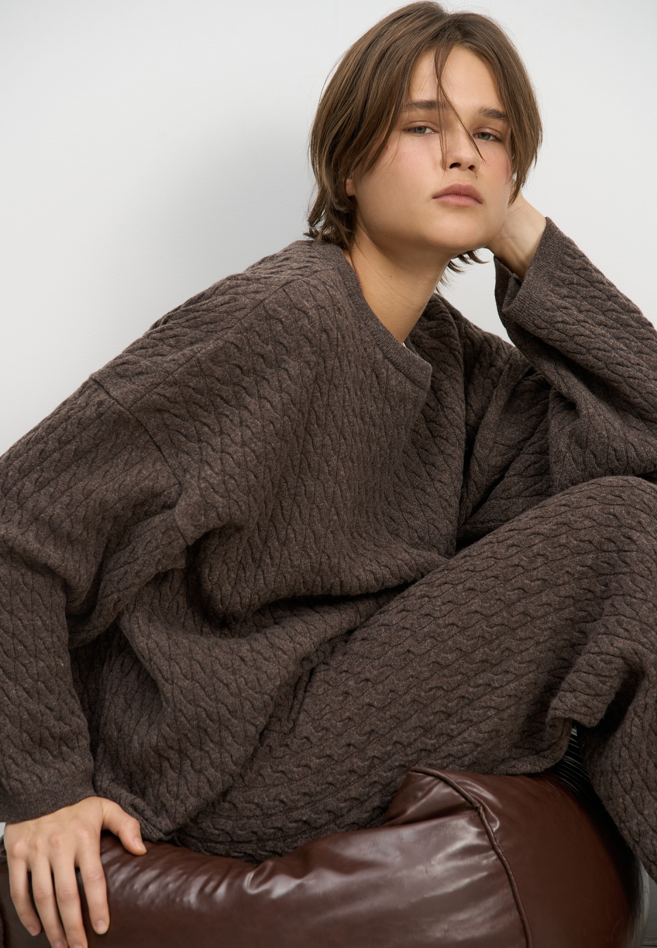 Трикотажные брюки с объемными косами из 100% шерсти мериноса экстрафайн. Модель на эластичной резинке и глубокими боковыми карманами.