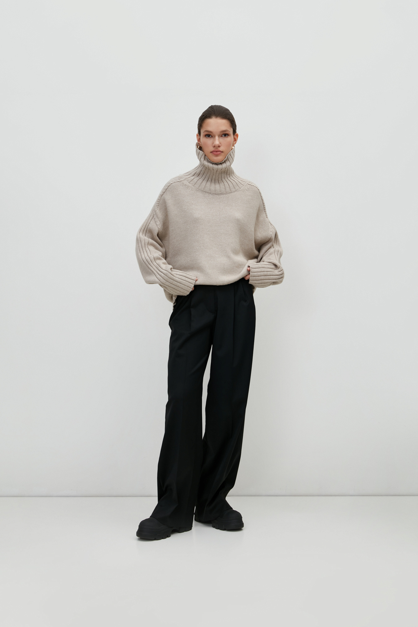Широкие брюки палаццо из смесовой шерсти. Модель прямого кроя с боковыми карманами и застежкой на молнию и крючок.
