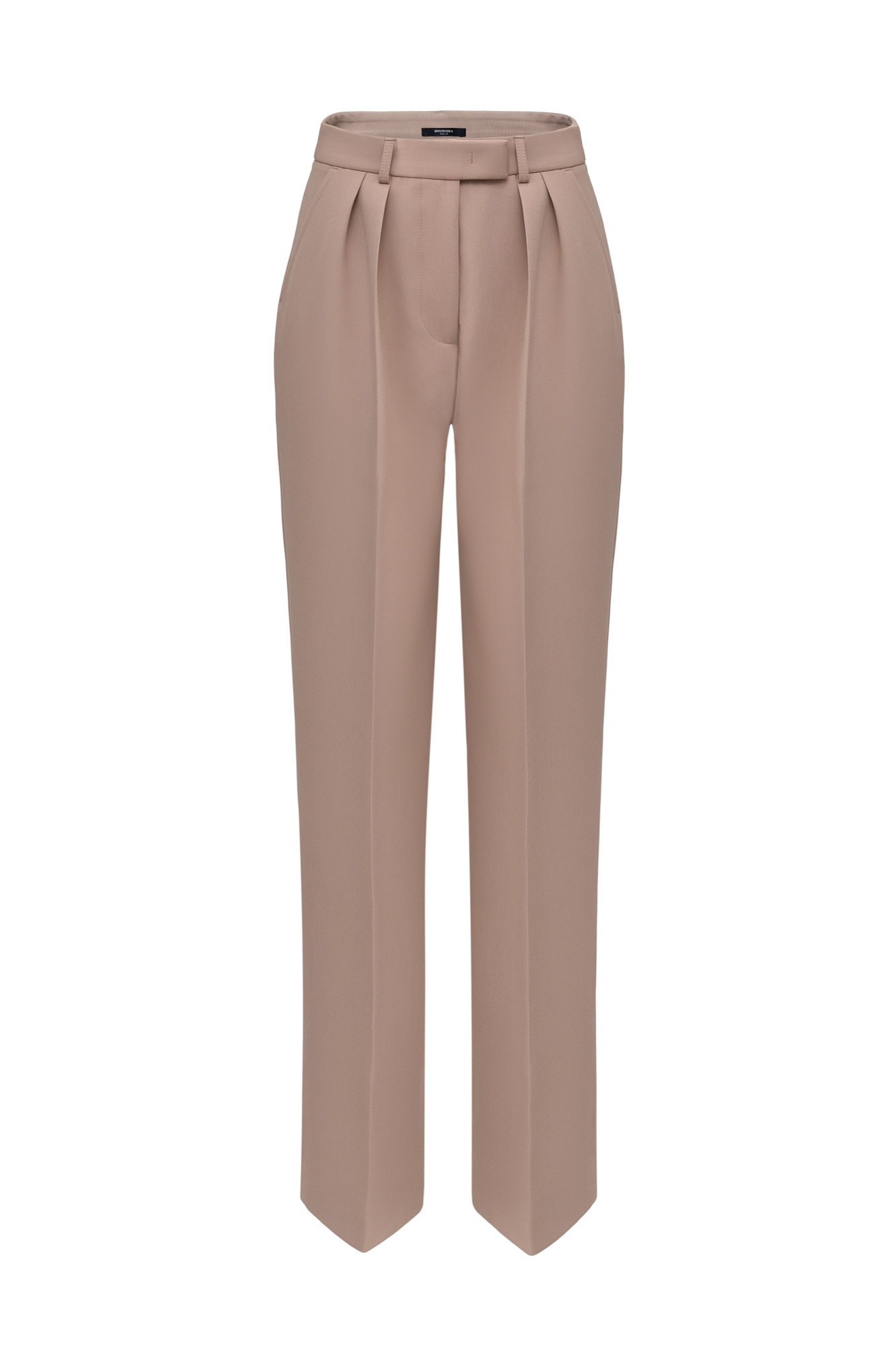 Брюки-бананы выполненные из поливискозы. Модель со средней посадкой, защипами на талии, шлевками на поясе для ремня и боковыми карманами. Застежка на молнию, крючок и внутреннюю пуговицу.