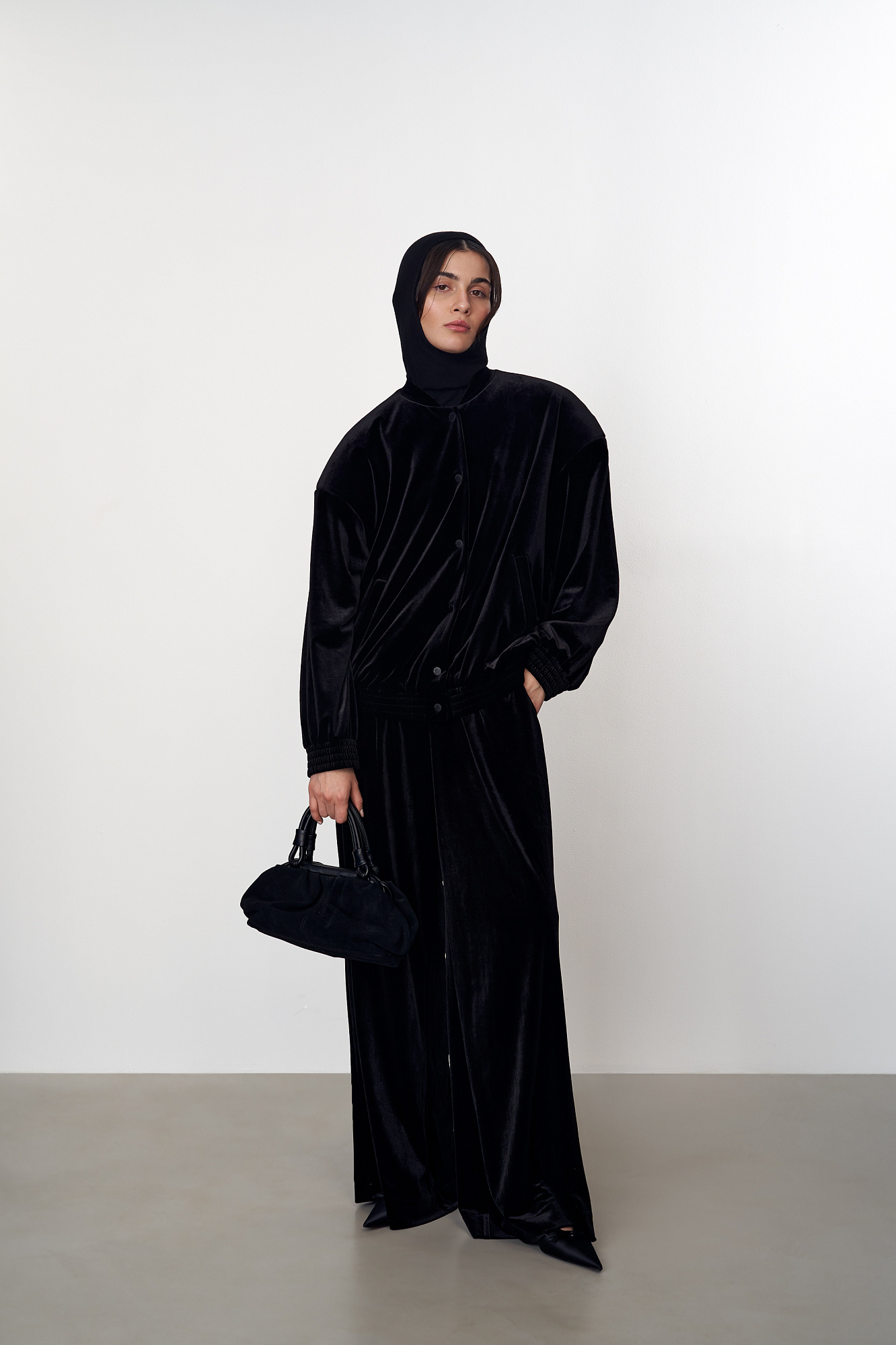 Бархатные брюки прямого кроя, выполненные в бельевом стиле, с эластичным поясом на резинке. Отличным дополнением для завершения образа станет бархатный бомбер.