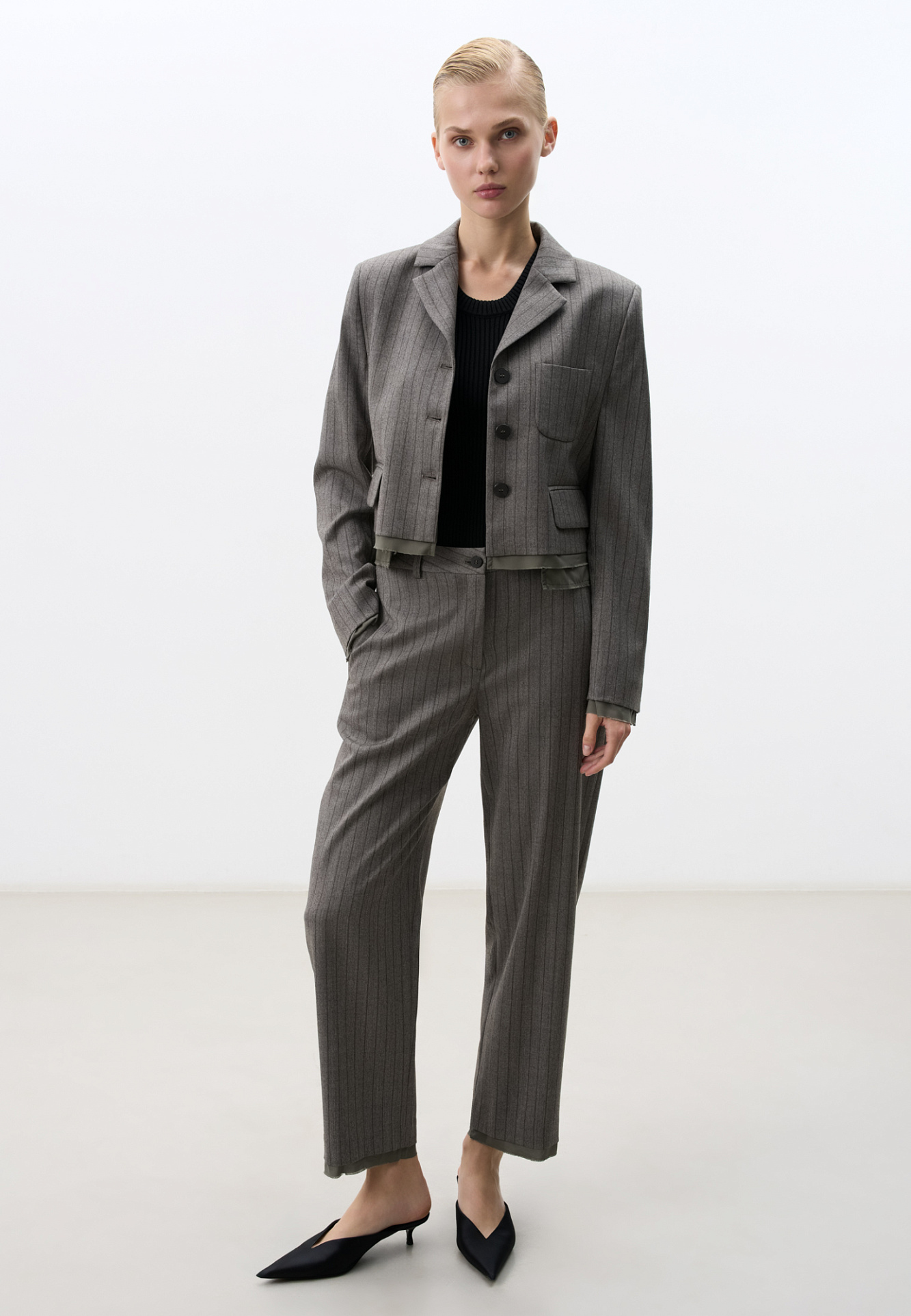 Брюки из шерсти в полоску. Модель прямого кроя, на средней посадке, с боковыми и задними карманами. Имитация торчащей подкладки внизу издедия. Застежка на молнию и пуговицу. Дополнить образ можно жакетом в таком же стиле.