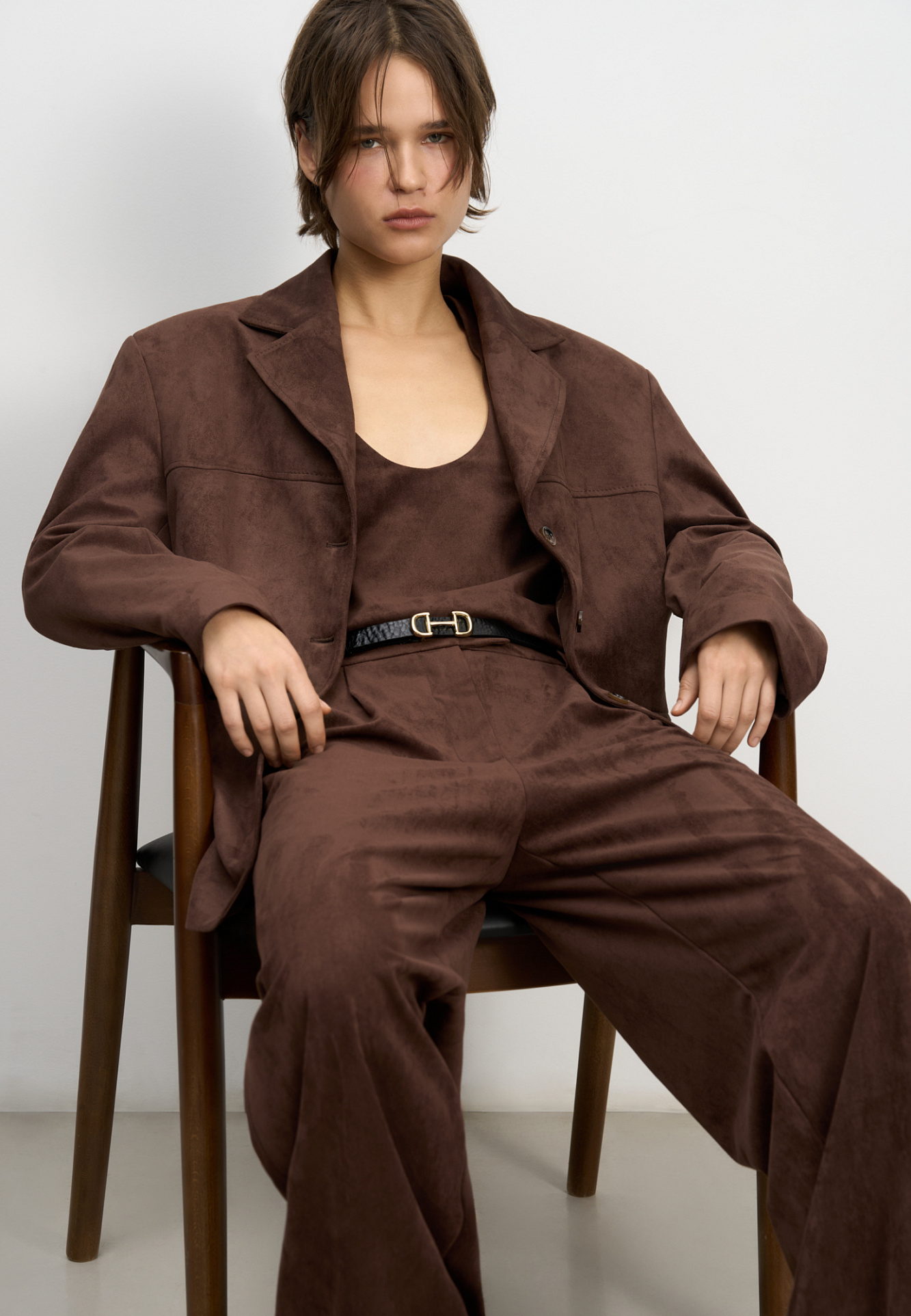 Брюки из ткани с имитацией внешнего вида и свойств натуральной замши. Модель с защипами на талии, шлевками на поясе для ремня. Застежка на скрытую пуговицу и брючный крючок. Отделка строчкой в тон.