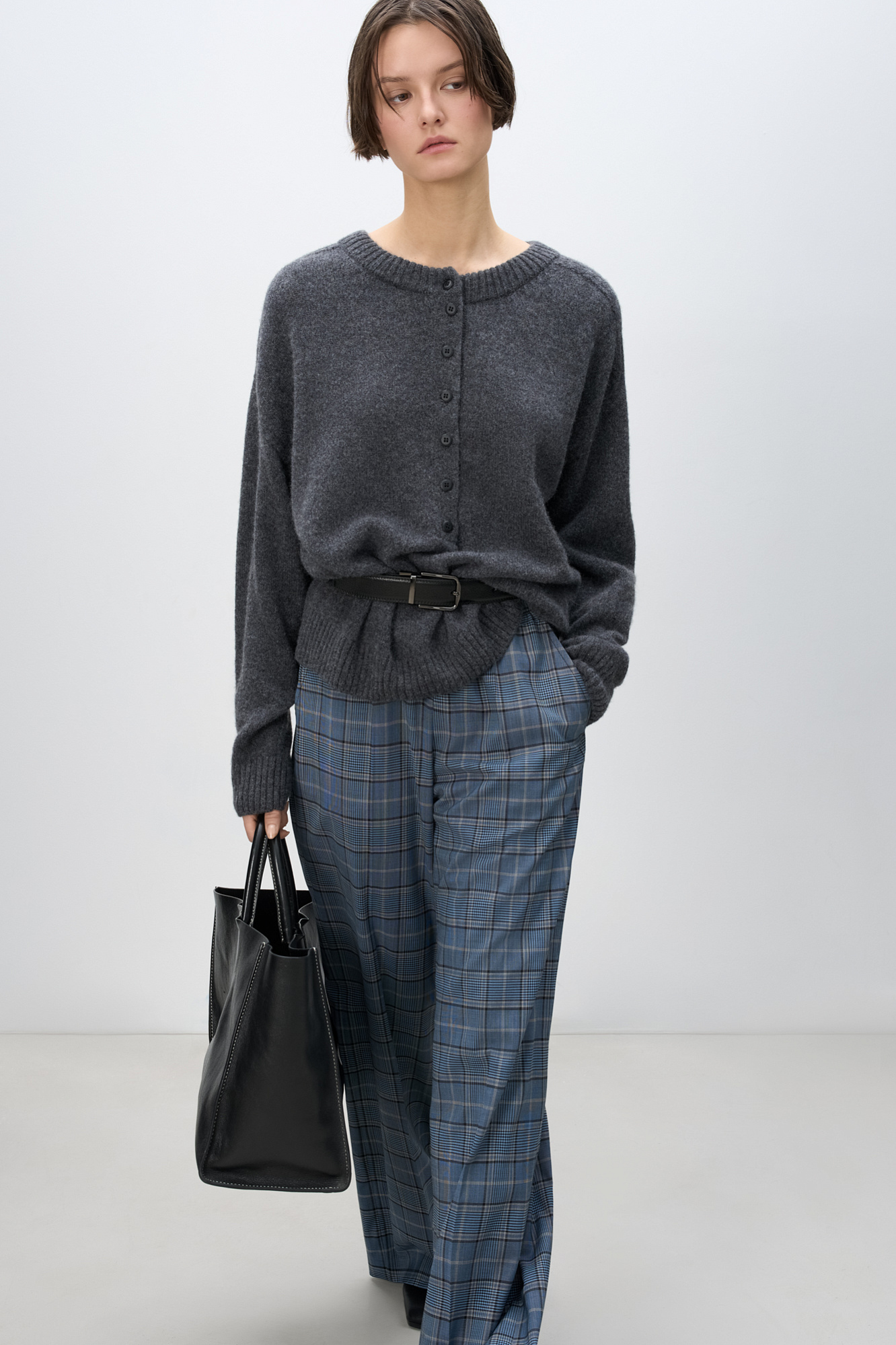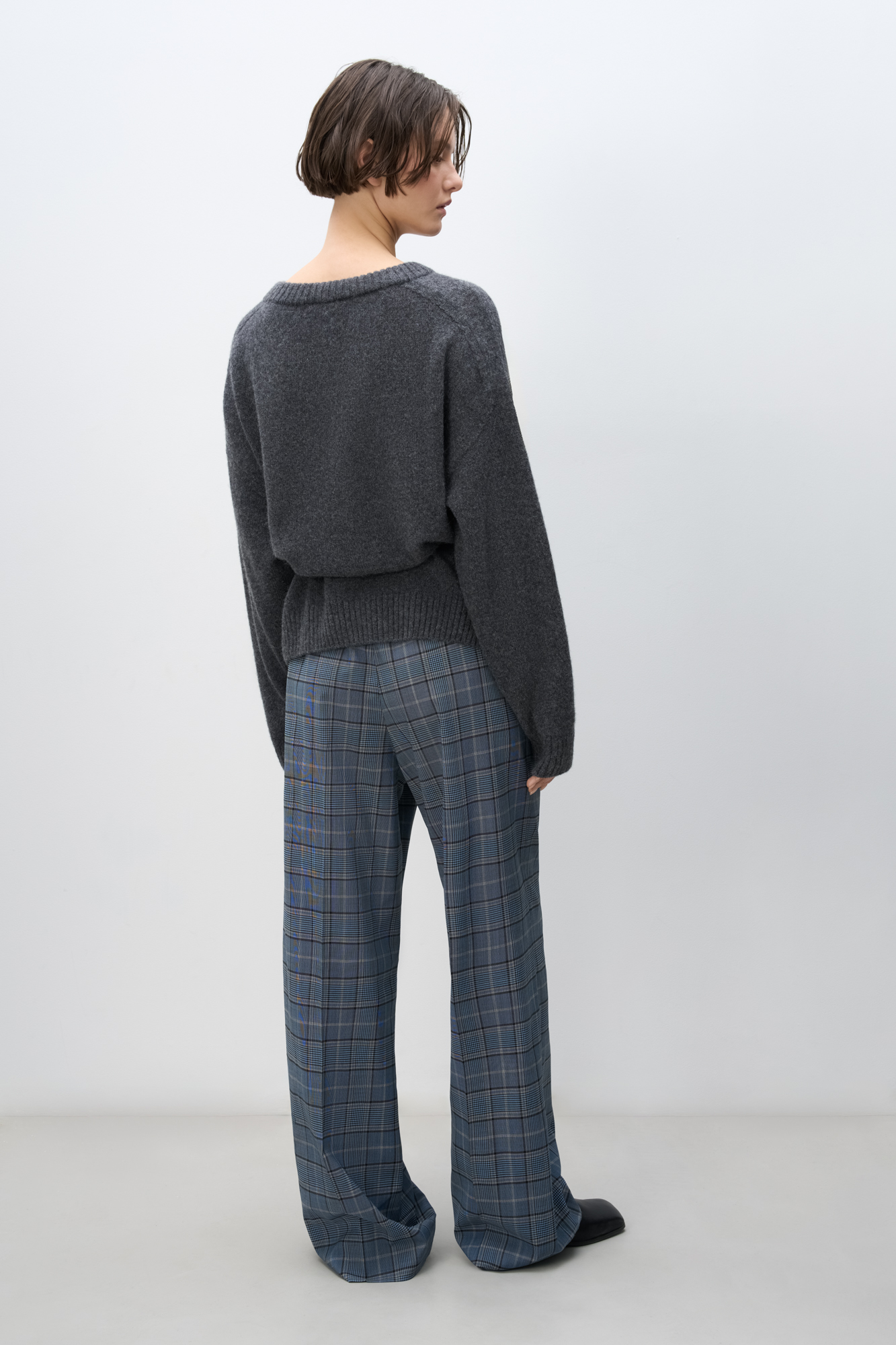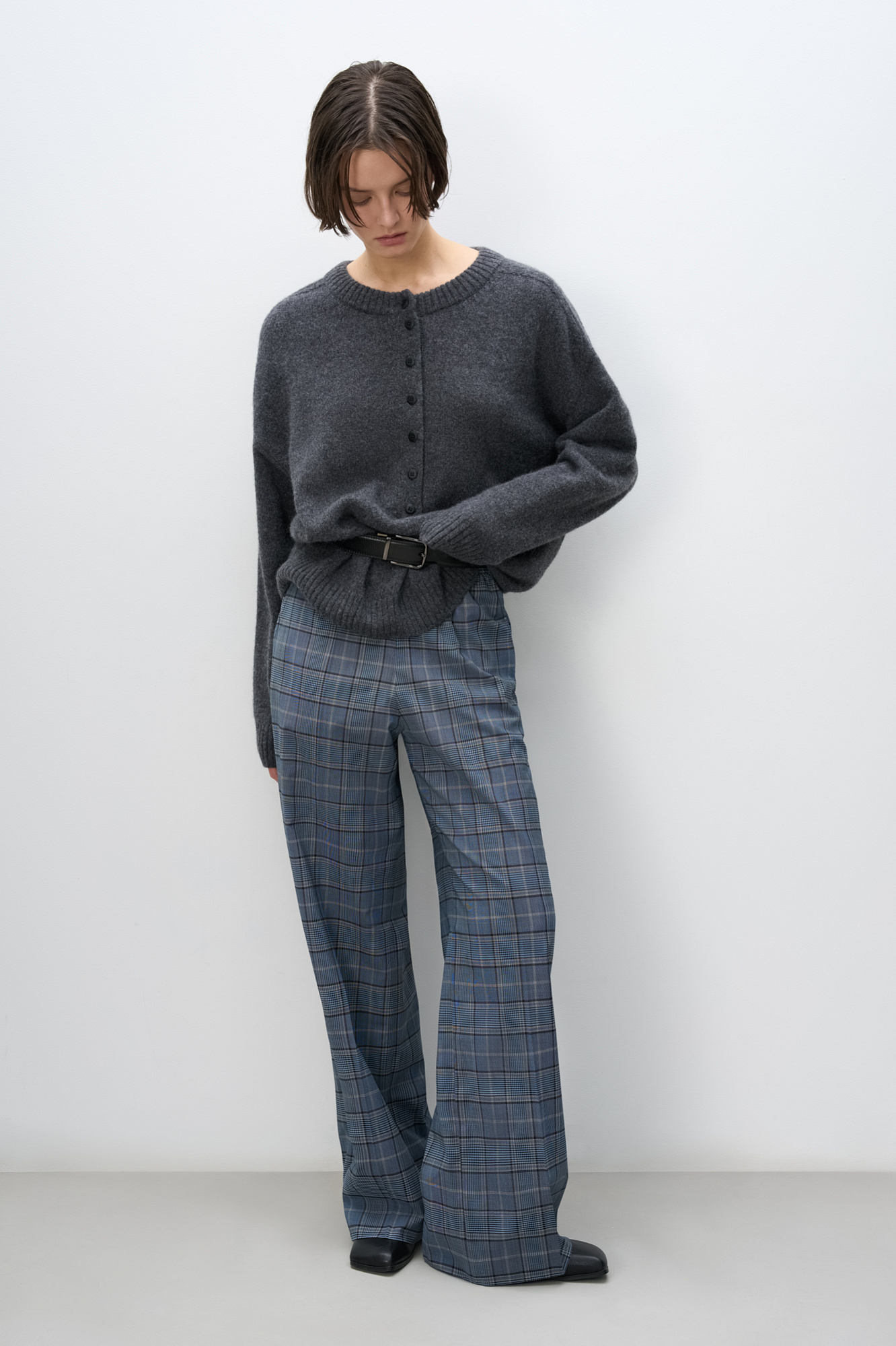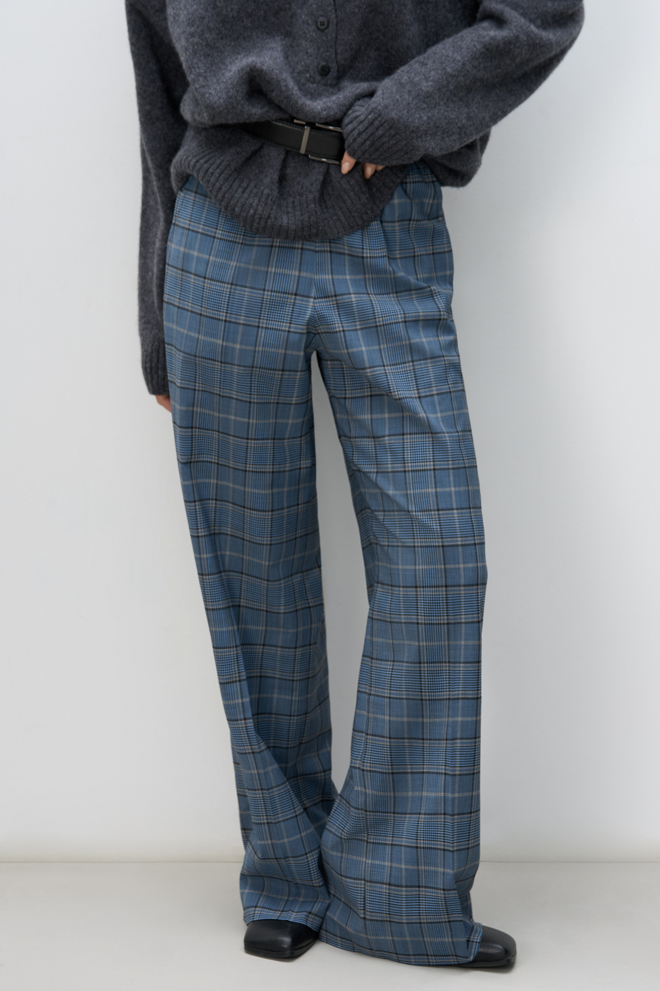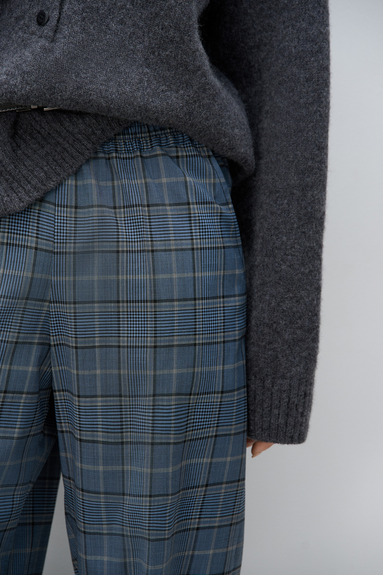 Прямые брюки из шерсти в клетку. Модель с широким поясом на эластичной резинке и двумя боковыми карманами.
