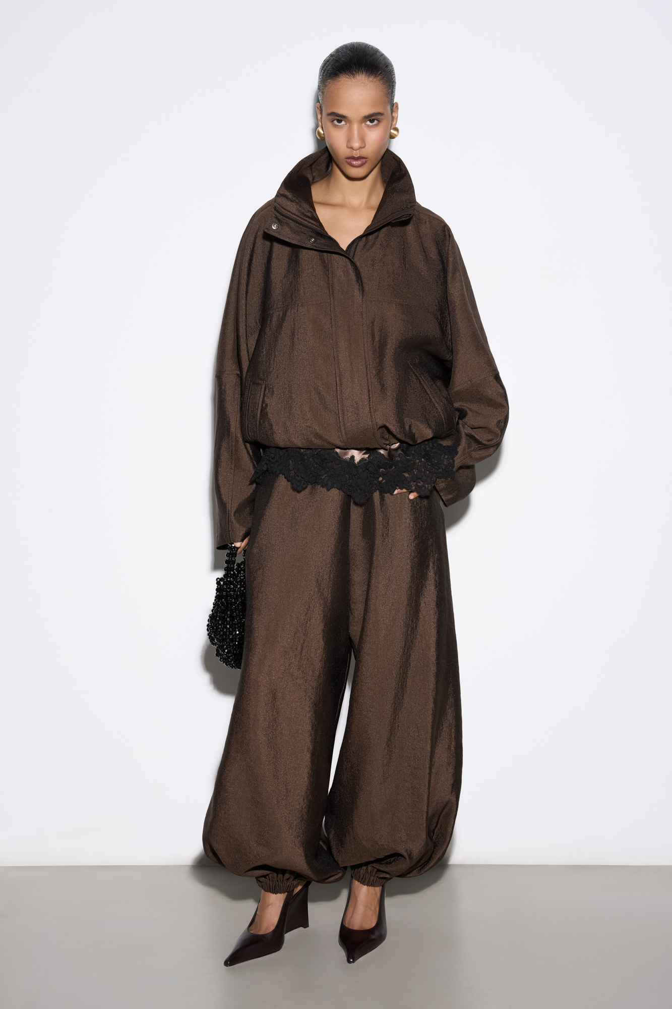 Широкие брюки-джоггеры из текстурной вискозы. Модель свободного силуэта с поясом на резинке.