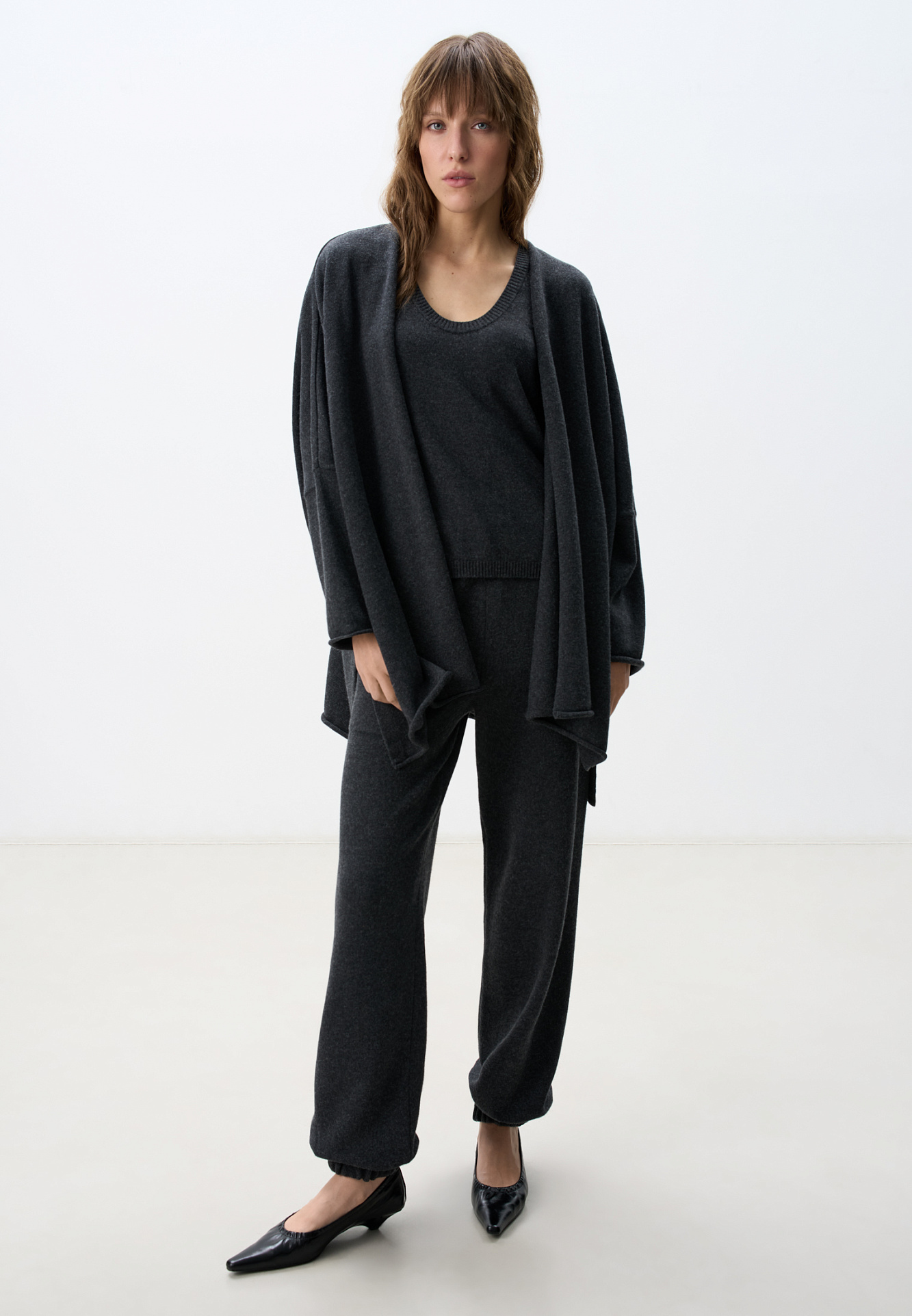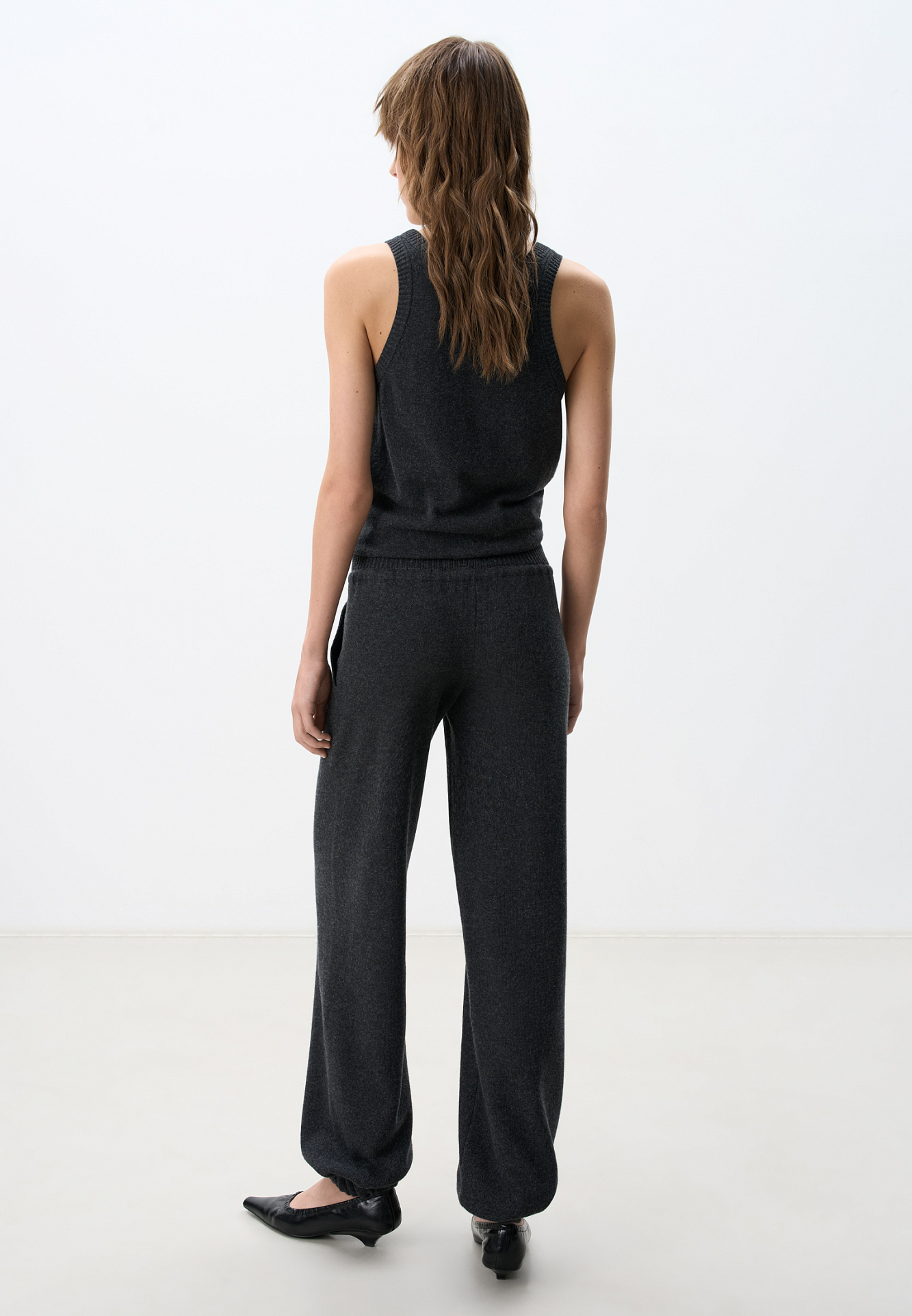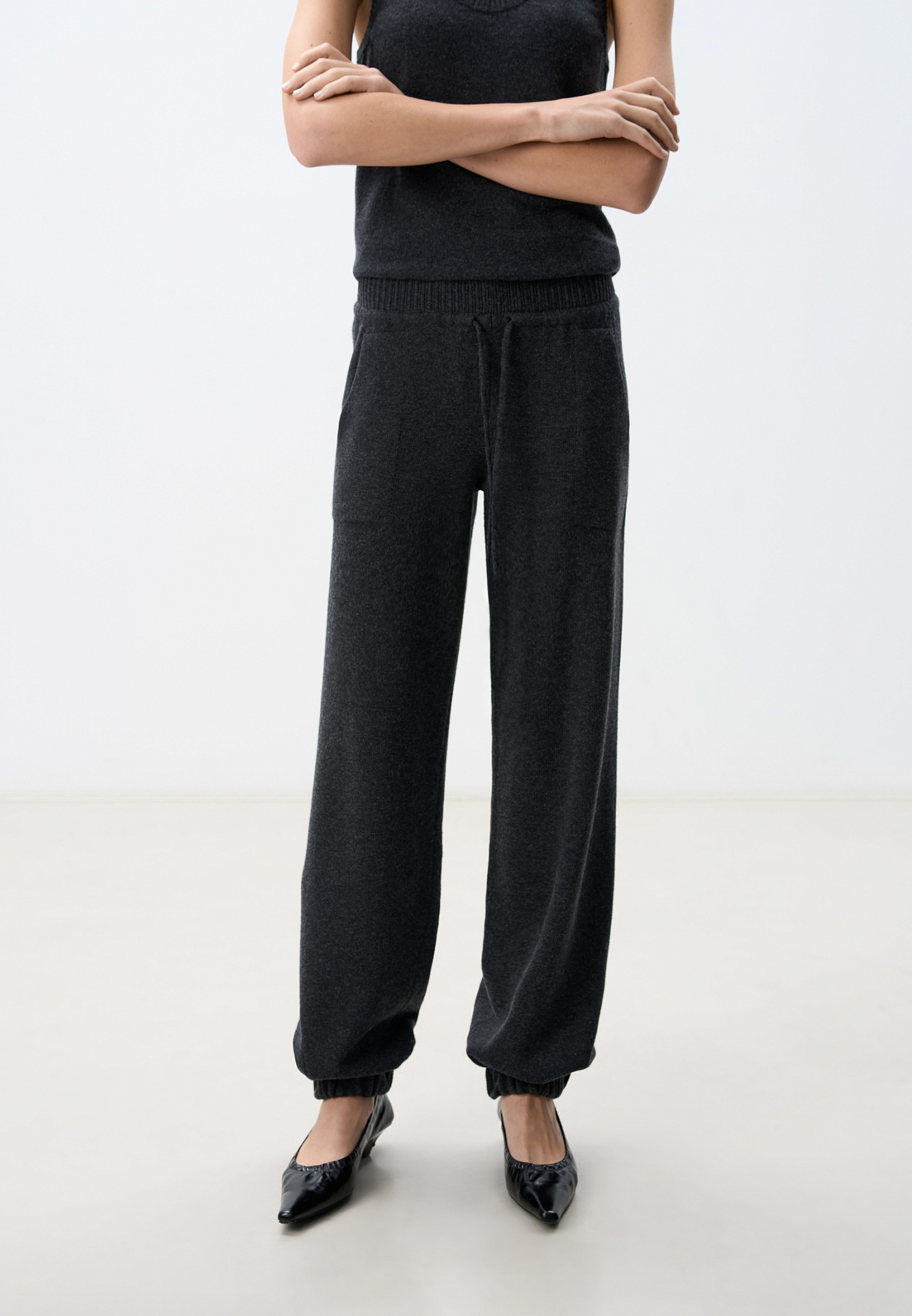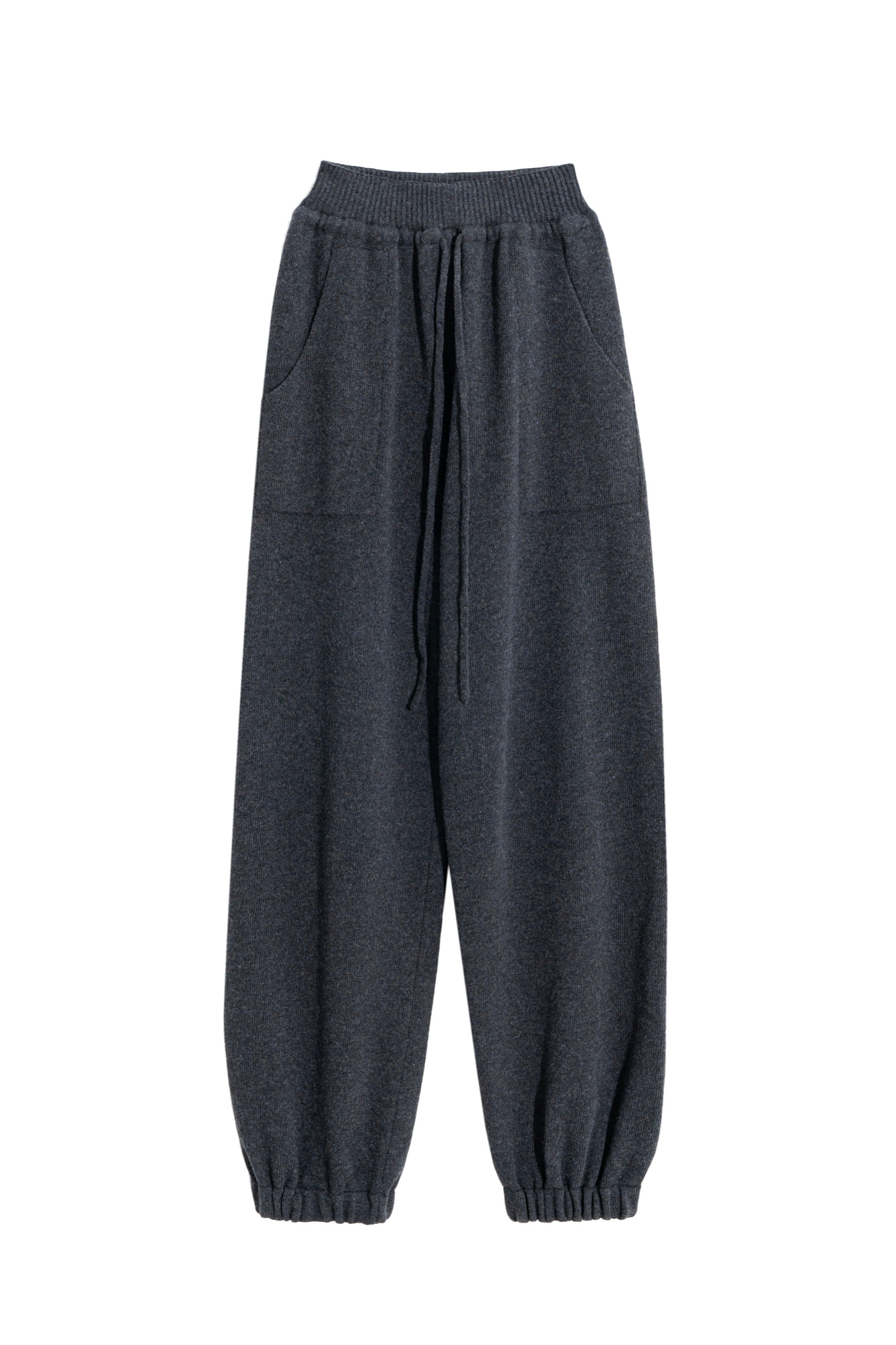 Трикотажные брюки-бананы из кашемира и шерсти. Модель свободного силуэта, с эластичным поясом в рубчик, дополненным кулиской, и двумя большими карманами. Манжеты выполнены на резинках.