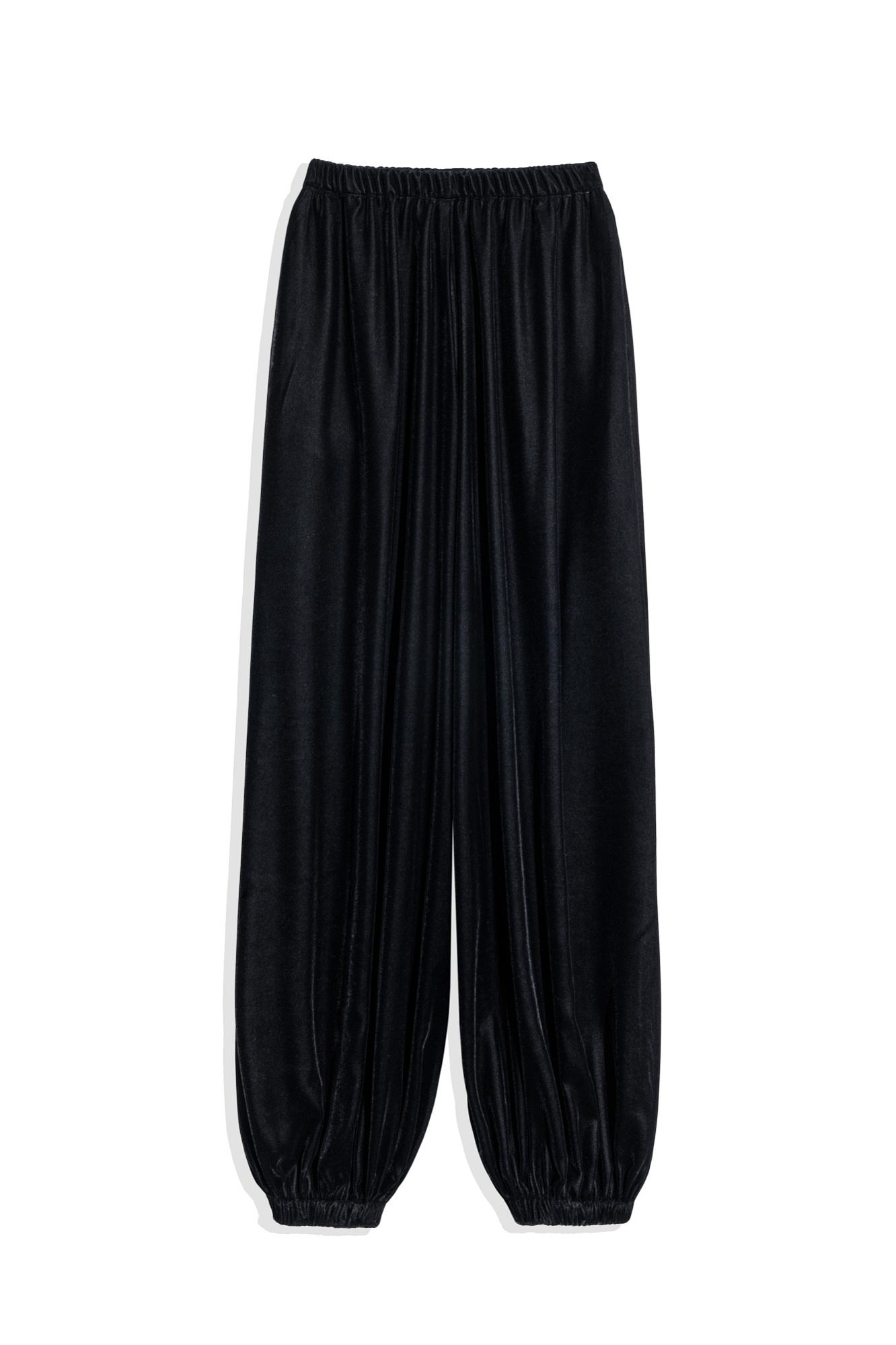 Широкие брюки-джоггеры из бархатной ткани. Модель свободного силуэта с поясом на резинке.