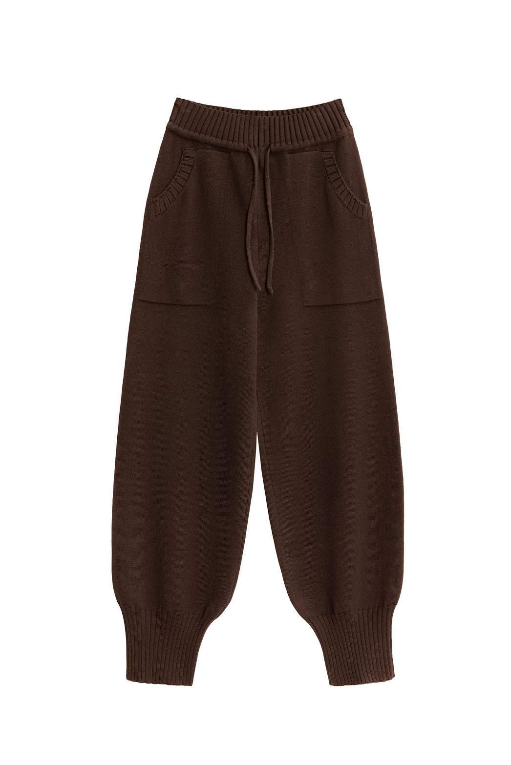 Трикотажные брюки из хлопка с добавлением вискозы. Модель выполнена в спортивном стиле, с широким эластичным поясом на кулиске, боковыми карманами и широкими манжетами на резинке.