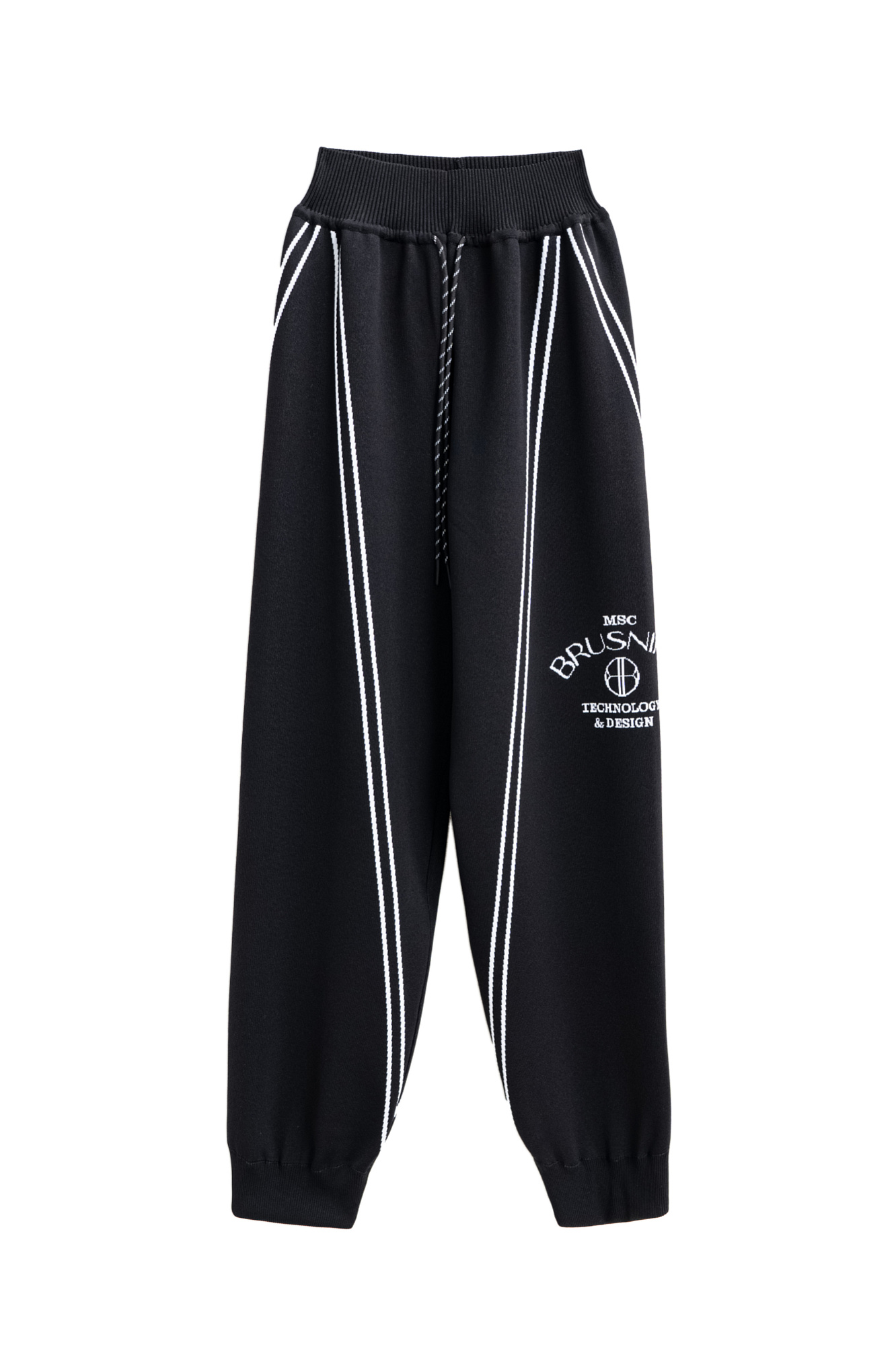 Трикотажные джоггеры из вискозы. Модель свободного силуэта, с широким эластичным поясом на кулиске, боковыми и задними карманами. Изделие декорировано брендированным жаккардом и лампасами контрастного цвета.