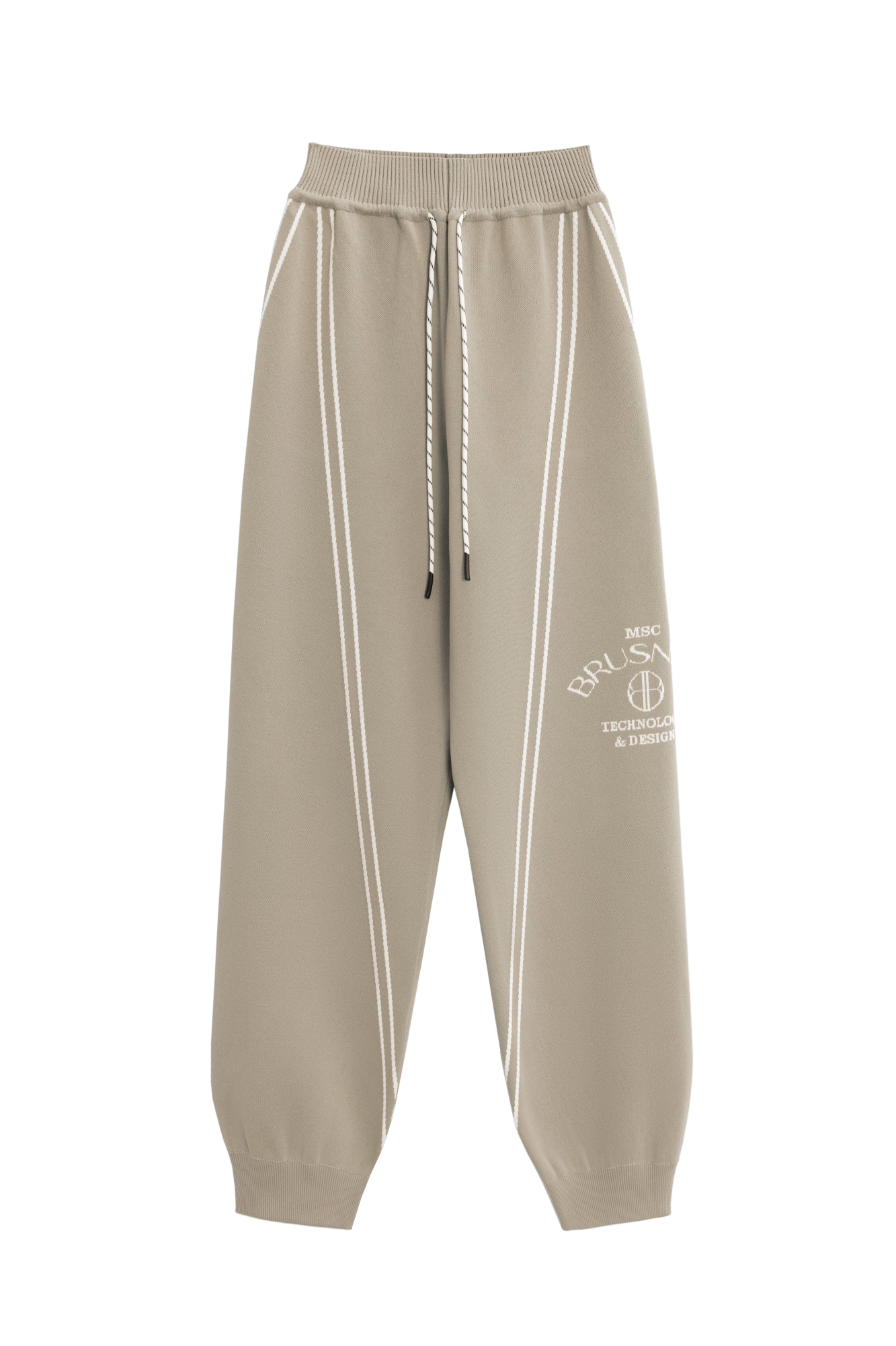 Трикотажные джоггеры из вискозы. Модель свободного силуэта, с широким эластичным поясом на кулиске, боковыми и задними карманами. Изделие декорировано брендированным жаккардом и лампасами контрастного цвета.