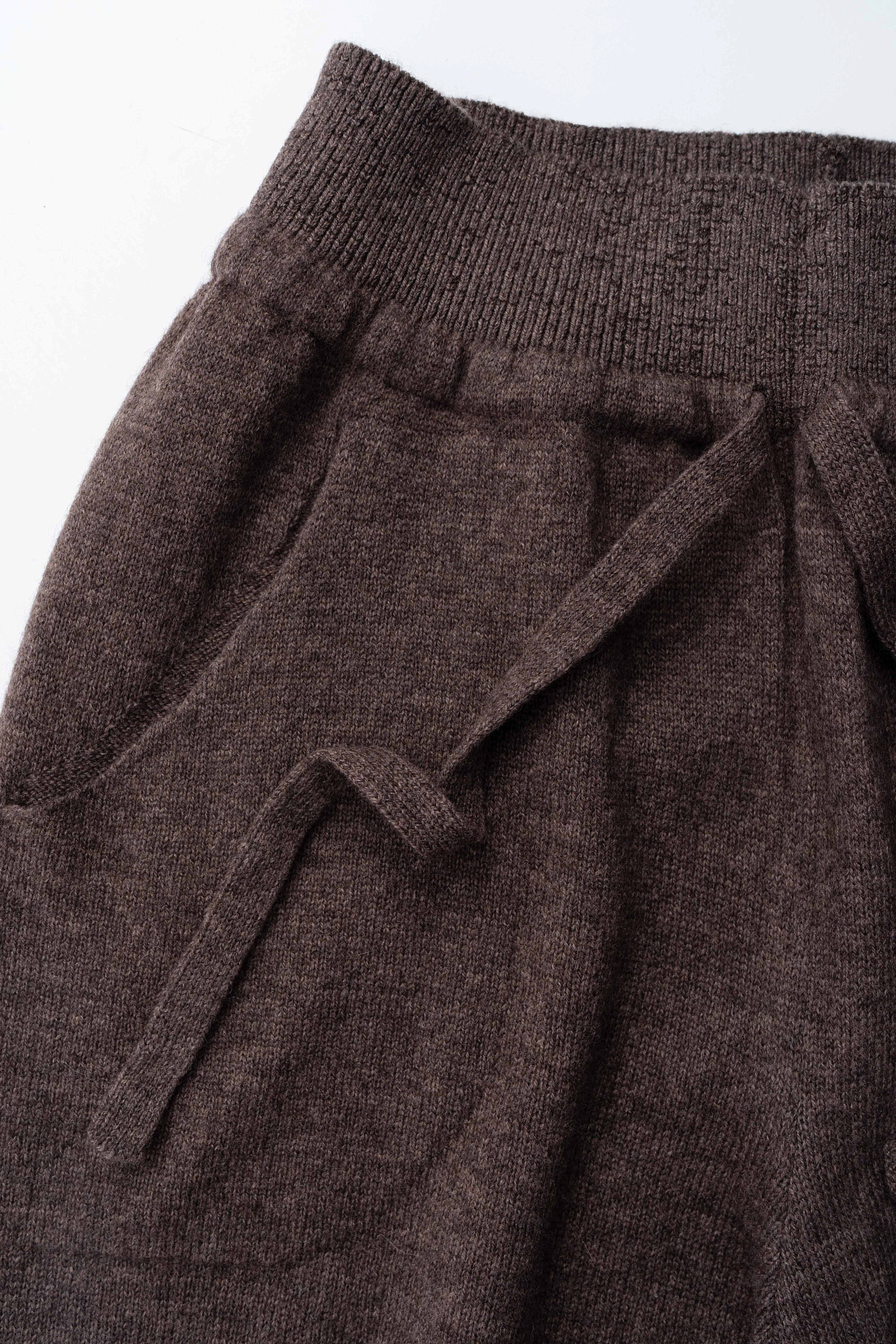 Трикотажные брюки из шерсти яка и мериноса экстрафайн. Модель с эластичным поясом на кулиске и округлыми карманами. Манжеты брюк и пояс выполнены в рубчик.