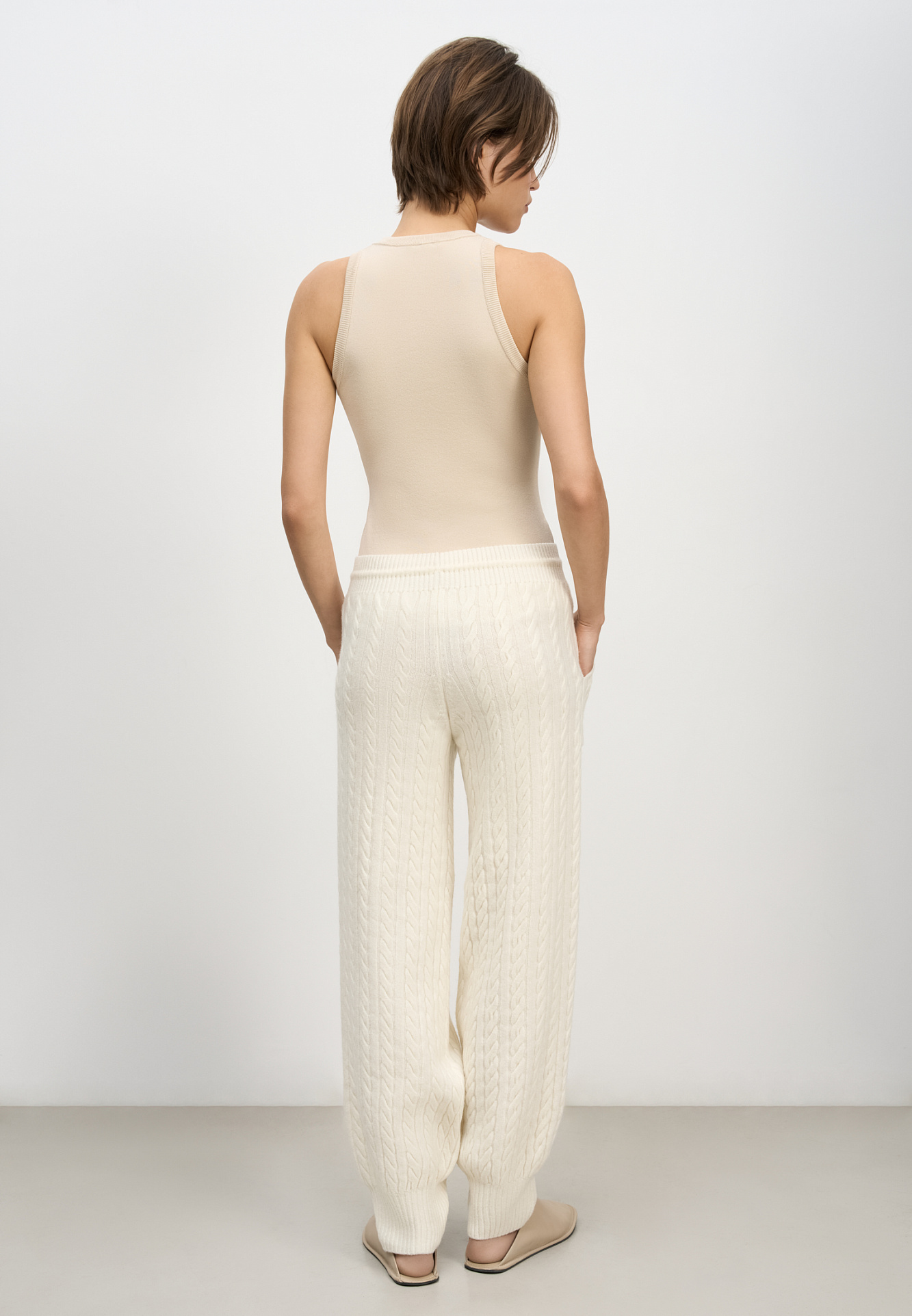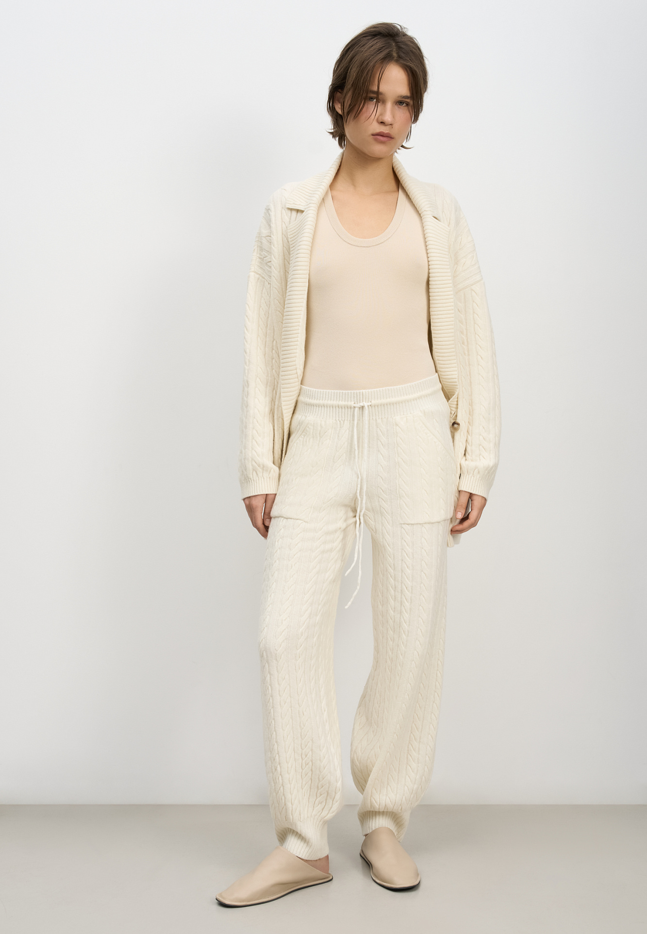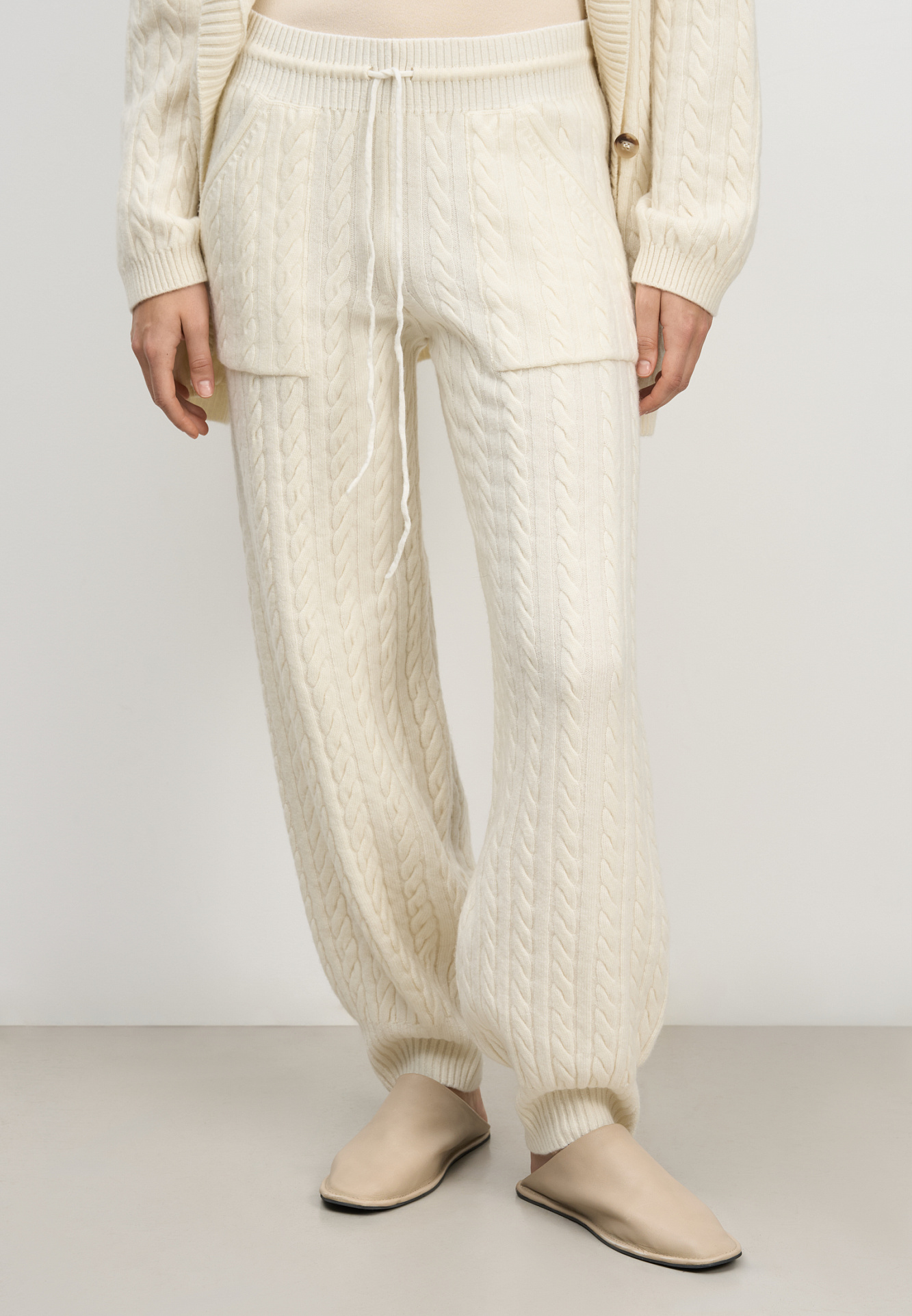 Трикотажные брюки-джоггеры из кашемира и шерсти с объемными косами. Модель с эластичным поясом, большими накладными карманами и манжетами в рубчик.