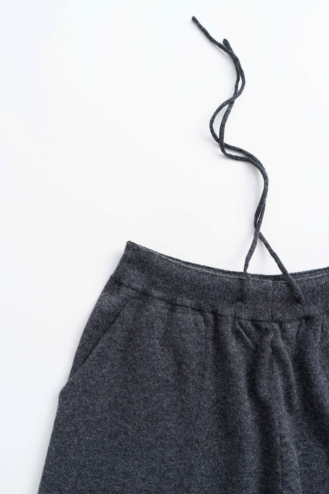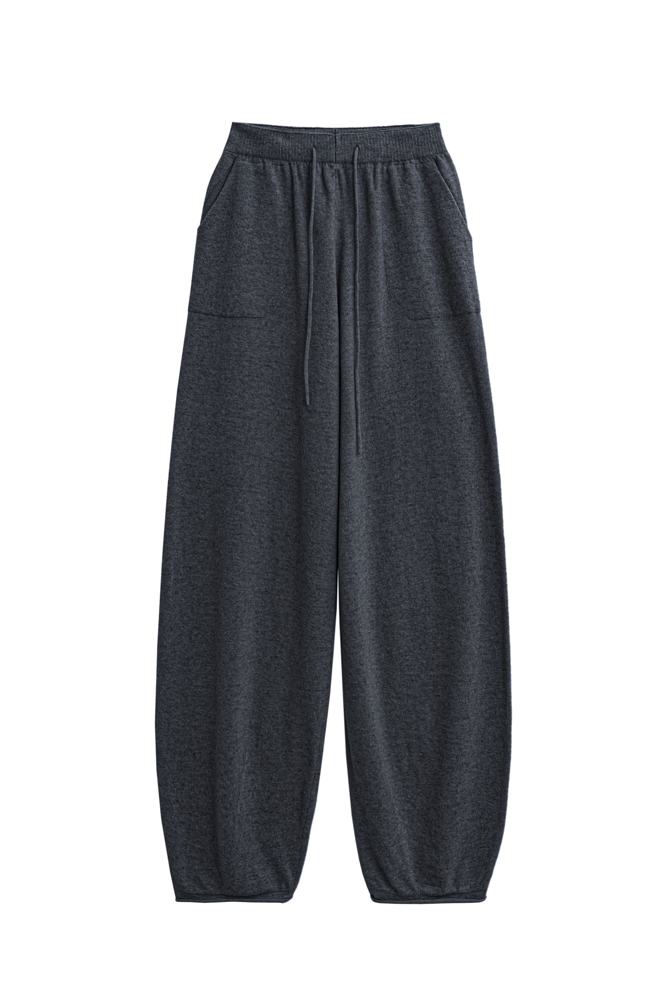 Трикотажные брюки-бананы из кашемира и шерсти. Модель с эластичным поясом, дополненным кулиской, большими накладными карманами и валиками-манжетами.