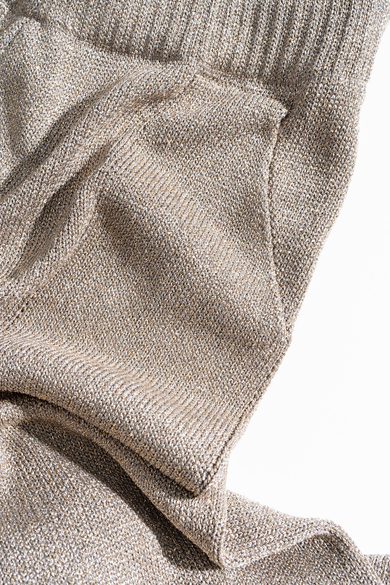 Трикотажные брюки-джоггеры из вискозы с добавлением люрекса. Модель с эластичным поясом на кулиске, боковыми карманами и манжетами на резинке.