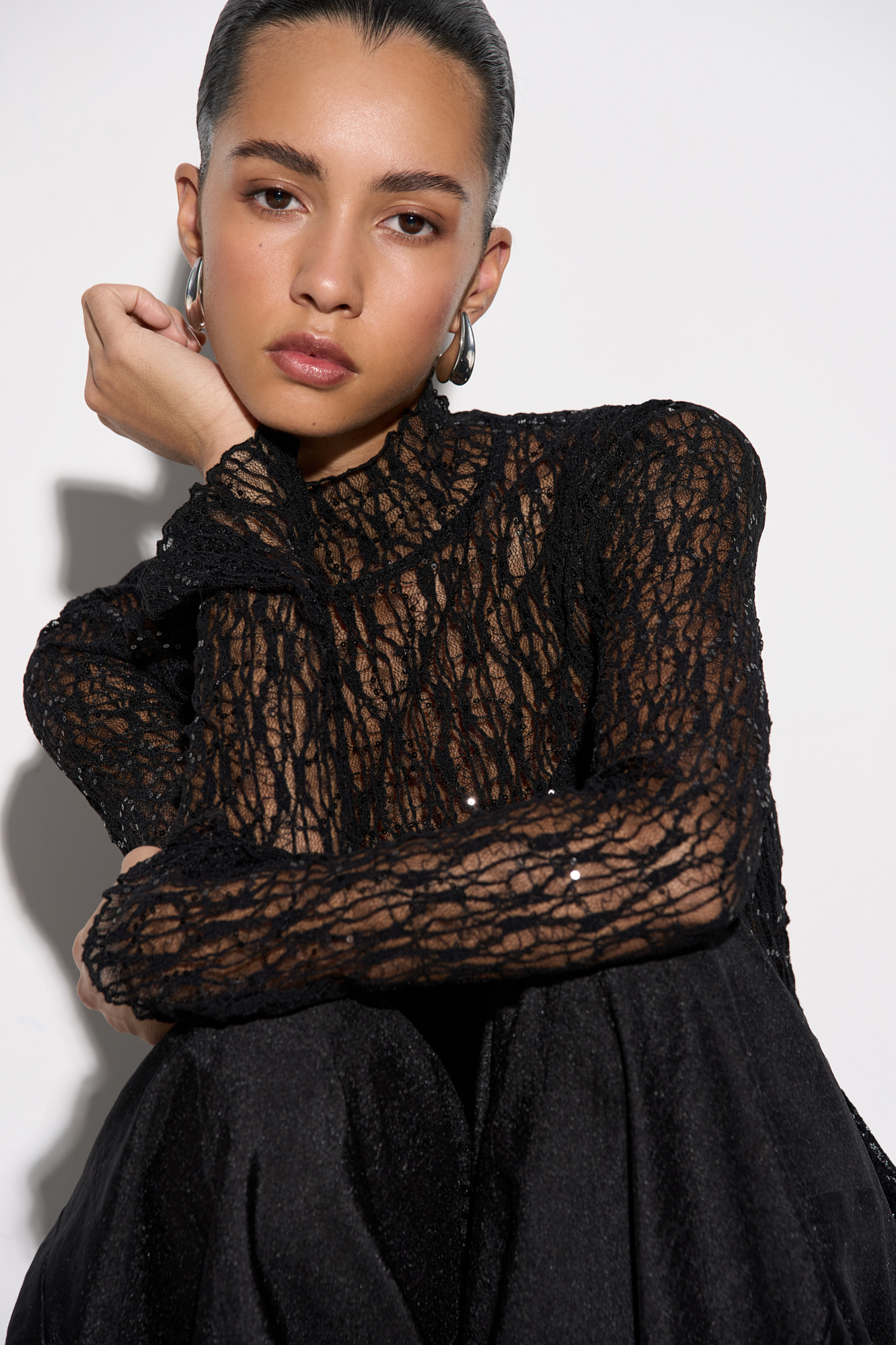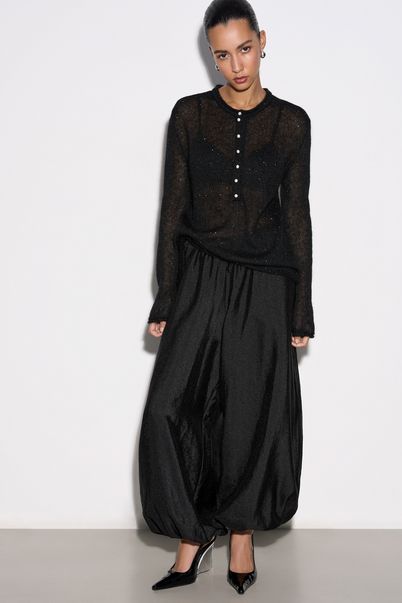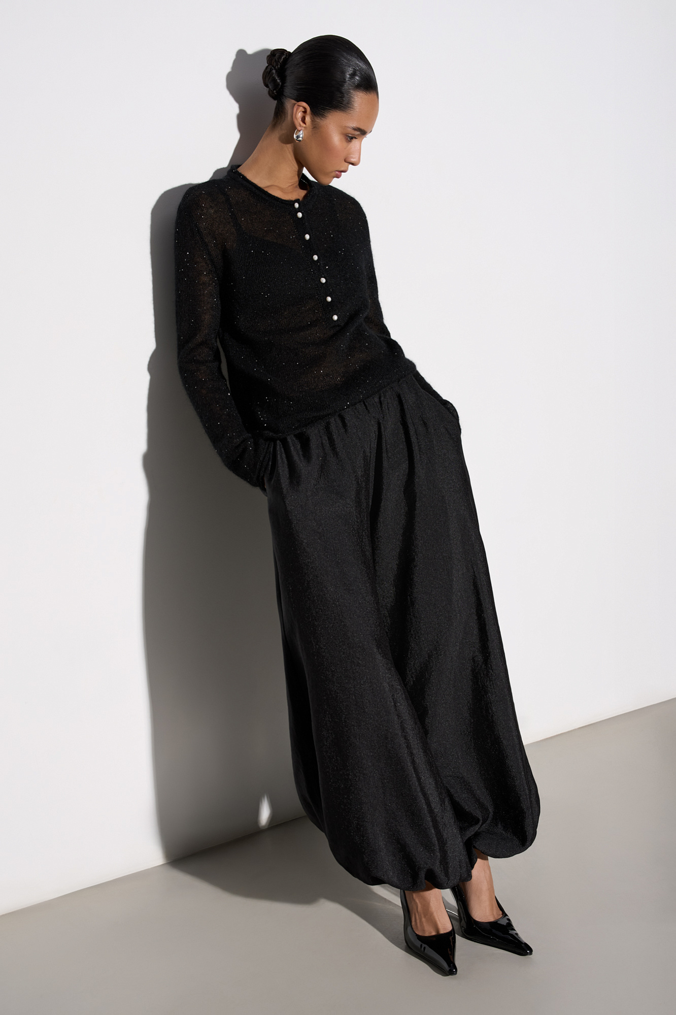 Широкие брюки-джоггеры из текстурной вискозы. Модель свободного силуэта с поясом на резинке.