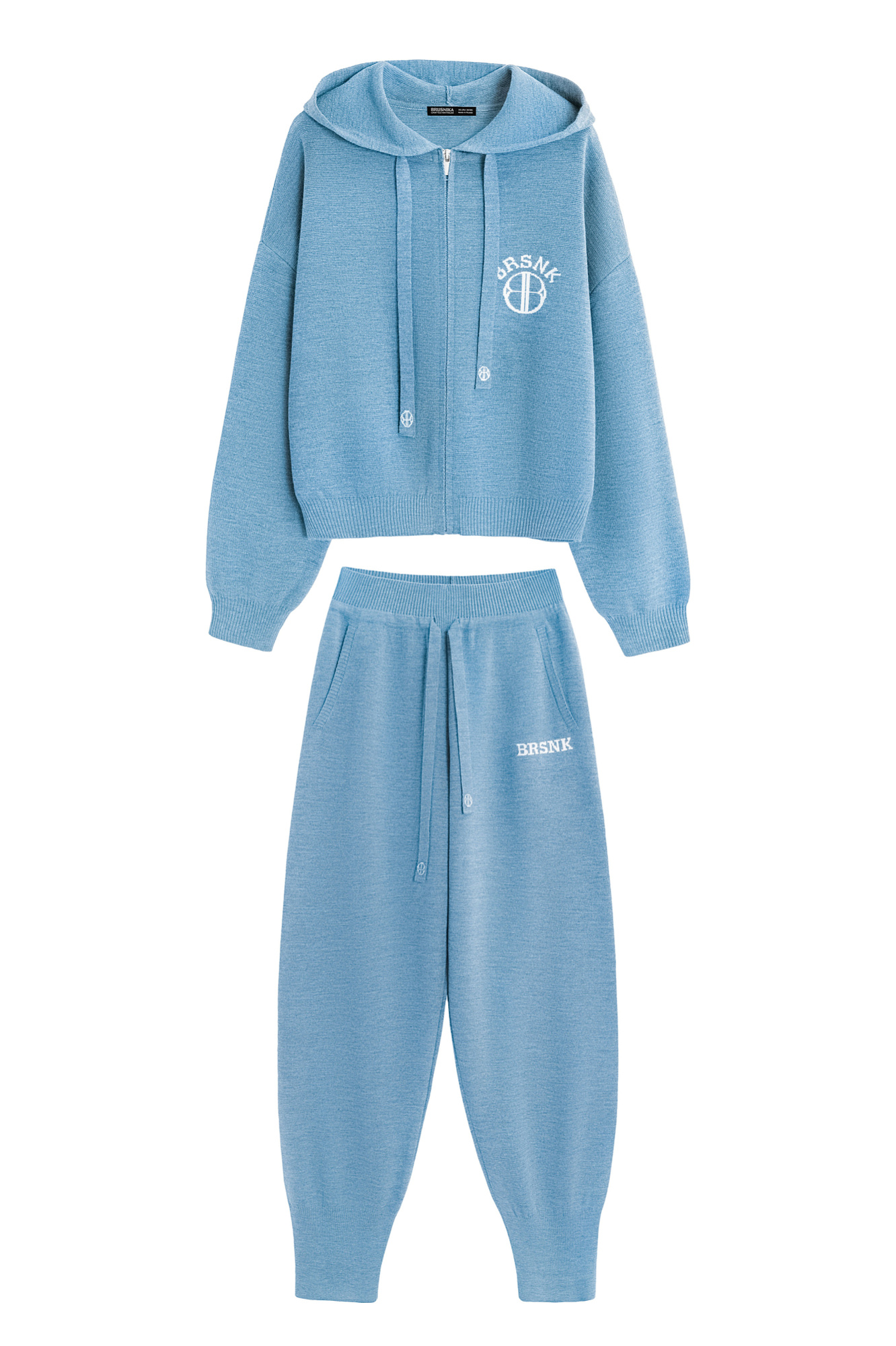 Трикотажный костюм в спортивном стиле из шерсти с добавлением акрила, состоящий из бомбера и брюк. Бомбер свободного силуэта, со спущенной линией плеча и капюшоном на кулиске. Низ изделия и манжеты рукавов выполнены на эластичной резинке. Застежка на молнию.
