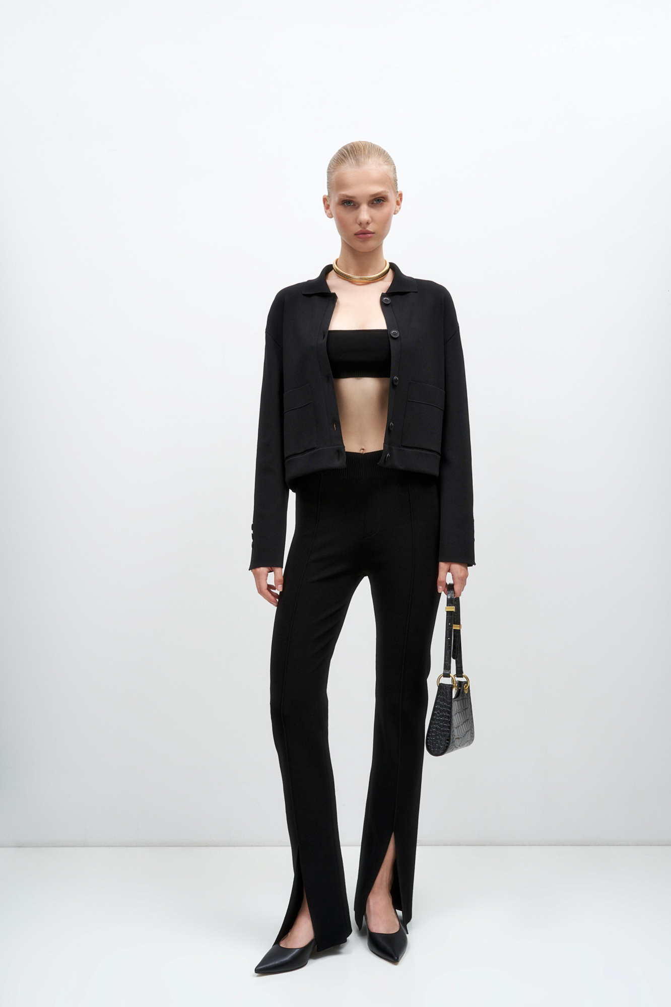 Трикотажные лосины со стрелками и разрезами спереди. Эластичный пояс на резинке и карманы сзади. Дополнить образ можно топом и бомбером.
