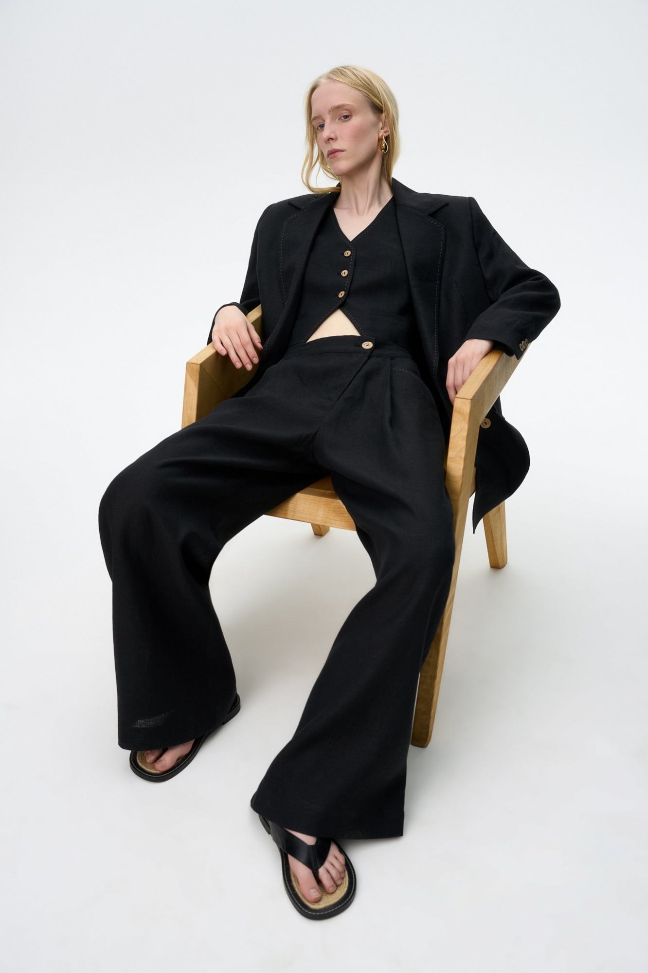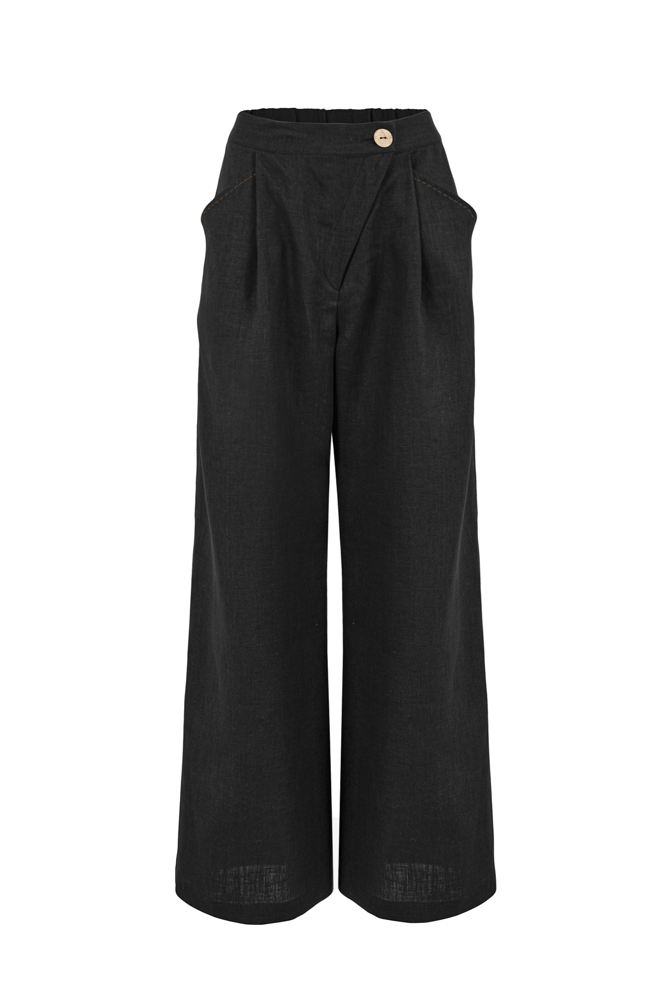 Брюки из 100% льна. Модель прямого кроя, с высокой посадкой, косой застежкой на пуговицу и молнию, боковыми карманами.