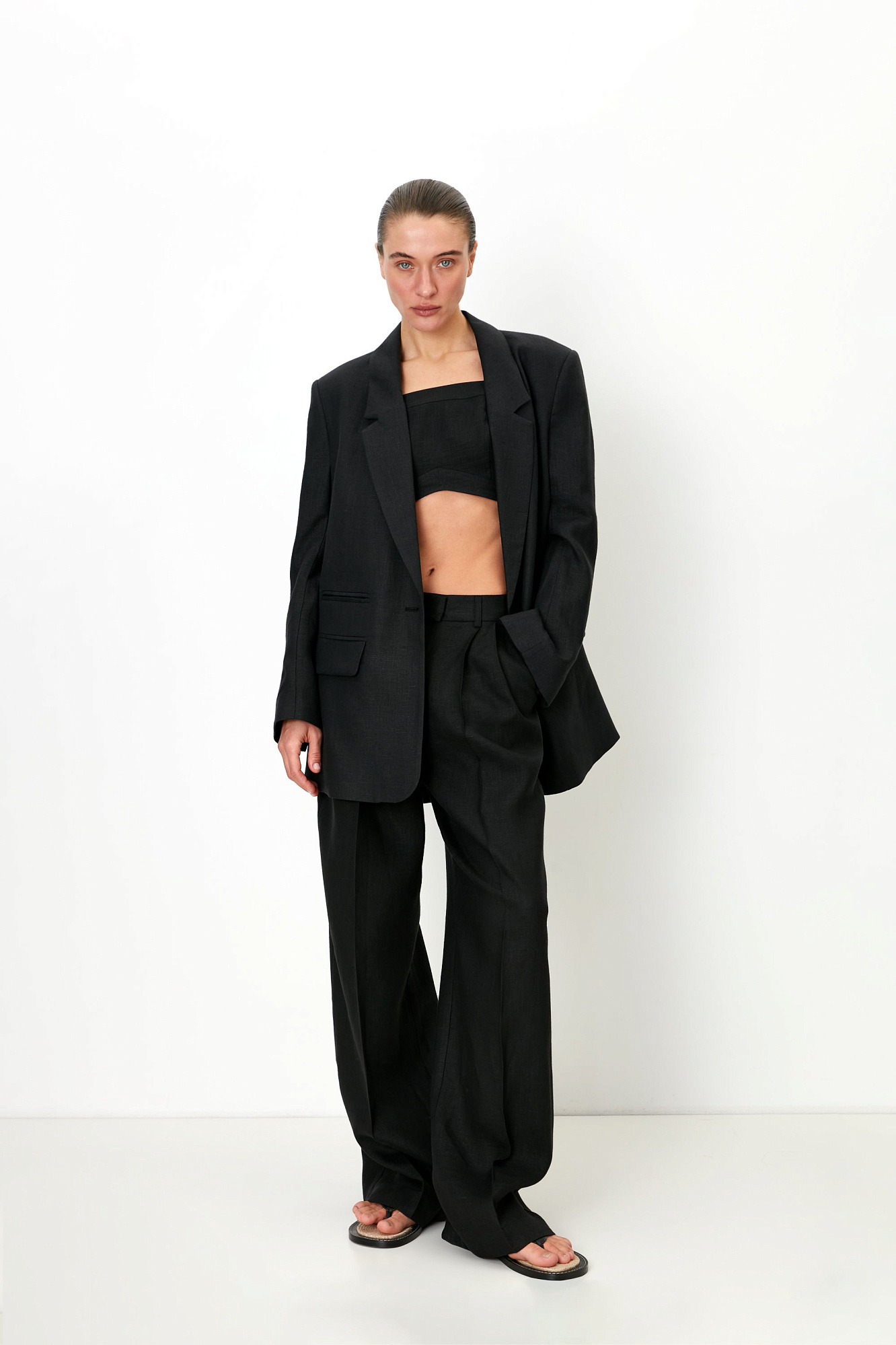 Брюки палаццо выполненные из 100% льна. Модель прямого кроя с защипами на талии, шлевками на поясе для ремня, карманами и застежкой на молнию и скрытый крючок. Дополнить образ можно жакетом.