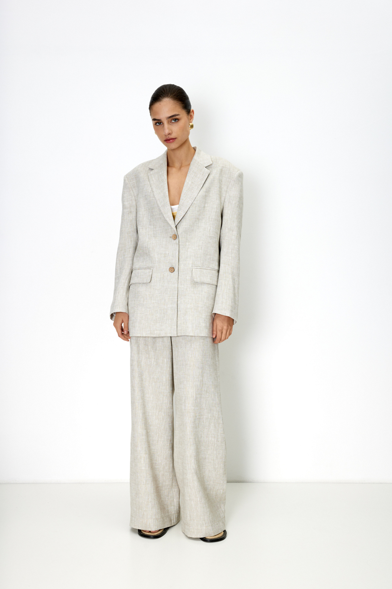 Широкие льняные брюки. Модель прямого силуэта с боковыми карманами и эластичным поясом на резинке с кулиской.