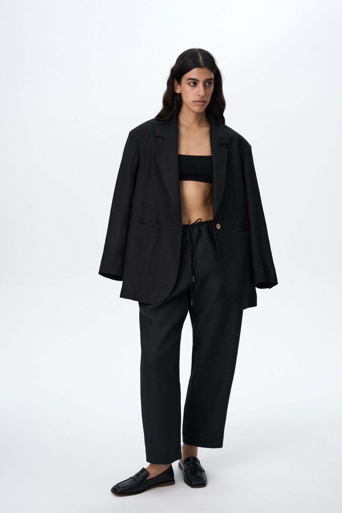 Брюки-бананы из 100% льна. Модель свободного силуэта с эластичным поясом на кулиске и боковыми карманами. Дополнить образ можно жакетом в таком же стиле.