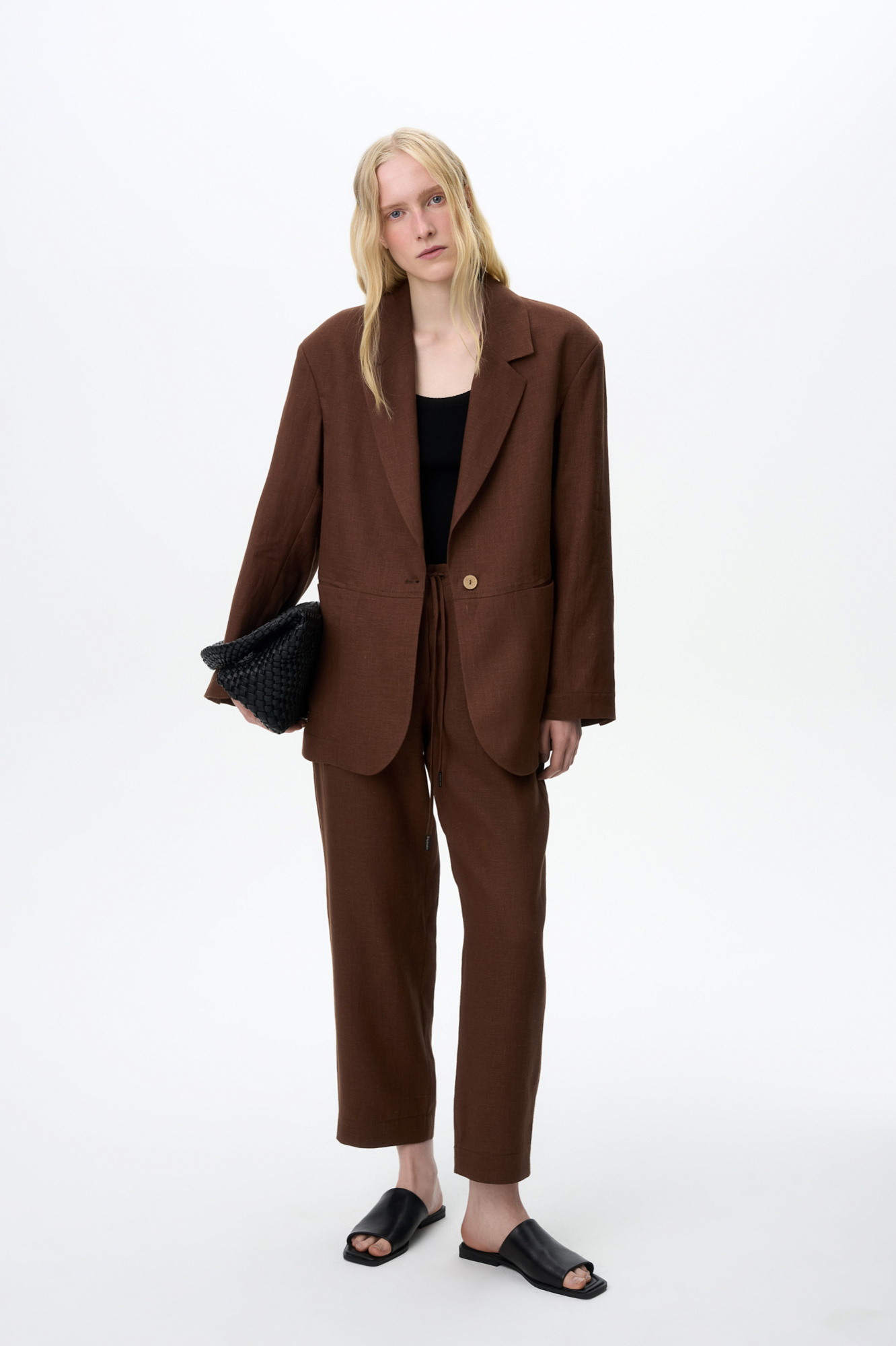 Брюки-бананы из 100% льна. Модель свободного силуэта с эластичным поясом на кулиске и боковыми карманами. Дополнить образ можно жакетом в таком же стиле.