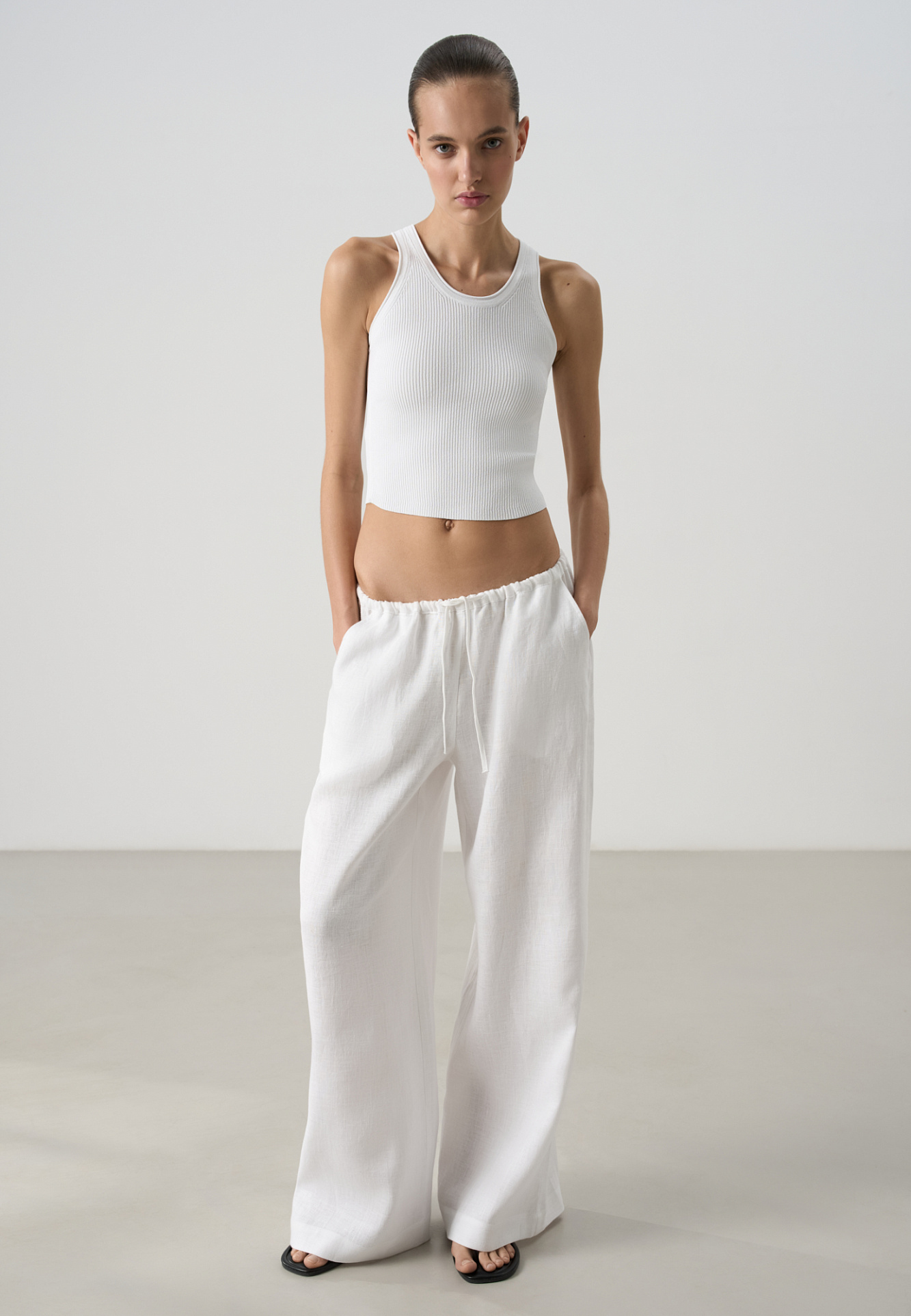 Широкие брюки из 100% льна. Модель свободного прямого кроя с врезными карманами по бокам. Изделие выполнено с поясом на узкой резинке, дополненным кулиской.