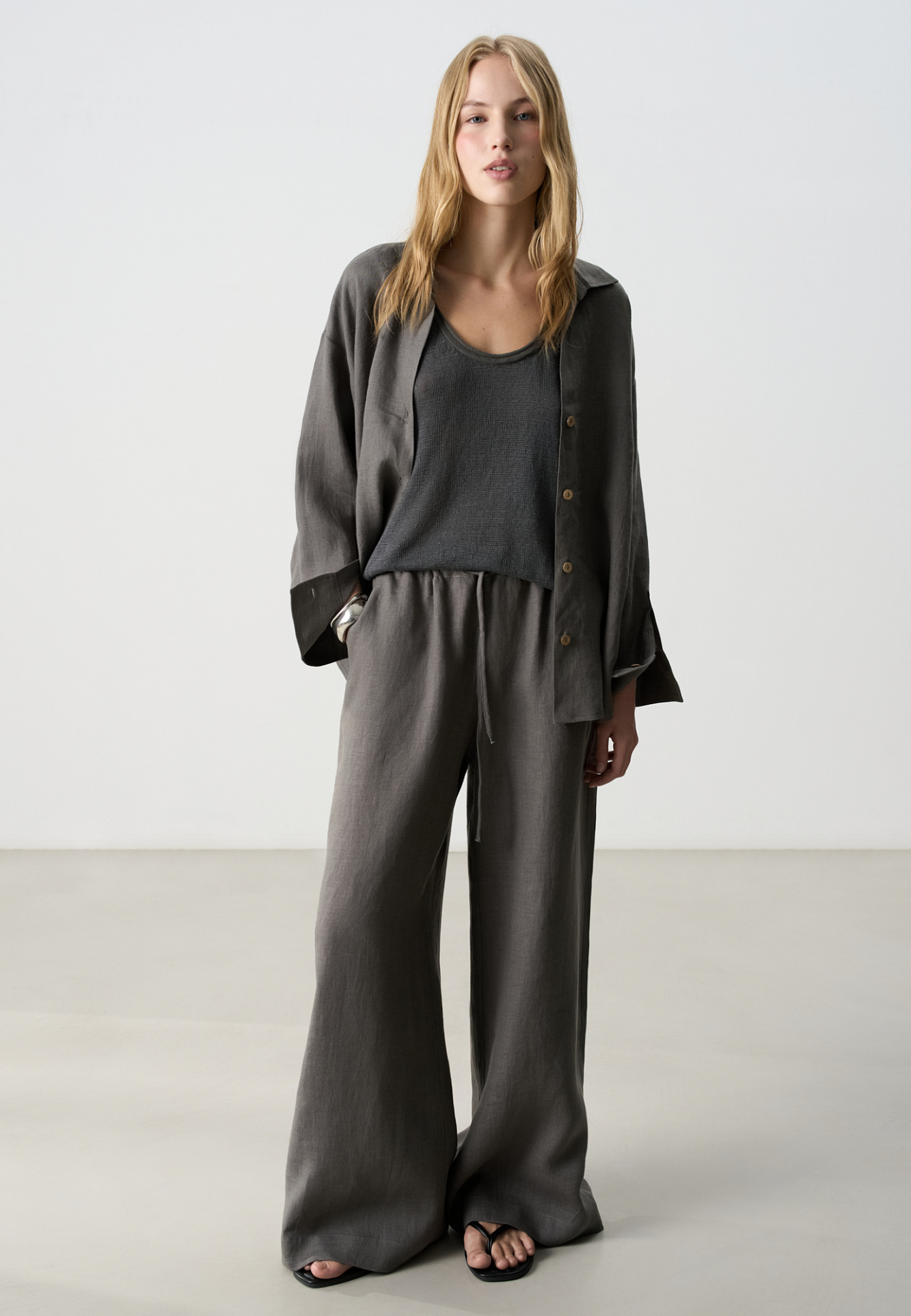 Широкие брюки из 100% льна. Модель свободного прямого кроя с врезными карманами по бокам. Изделие выполнено с поясом на узкой резинке, дополненным кулиской.