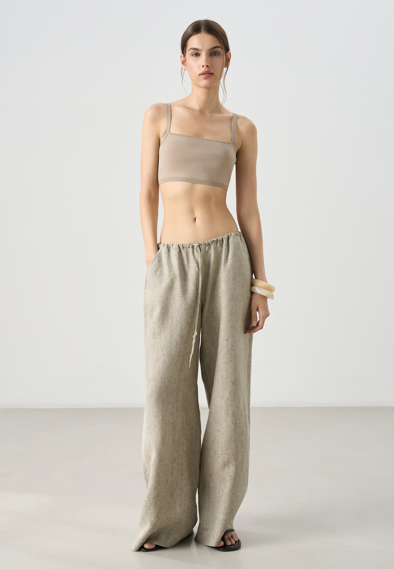 Брюки из 100% льна. Модель прямого кроя с широкими штанинами и двумя боковыми карманами. Изделие выполнено с поясом на кулиске.