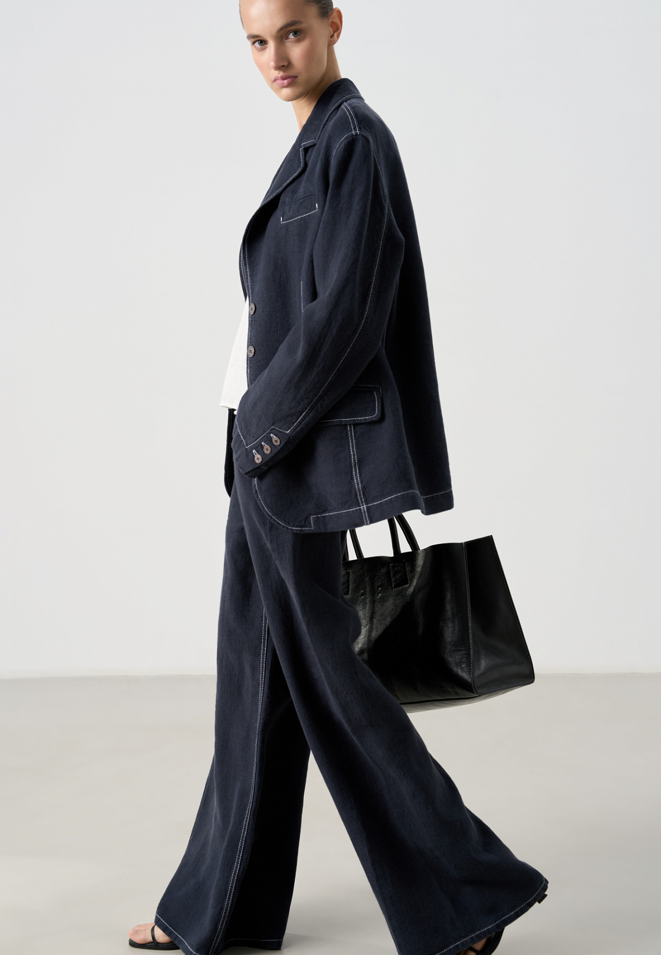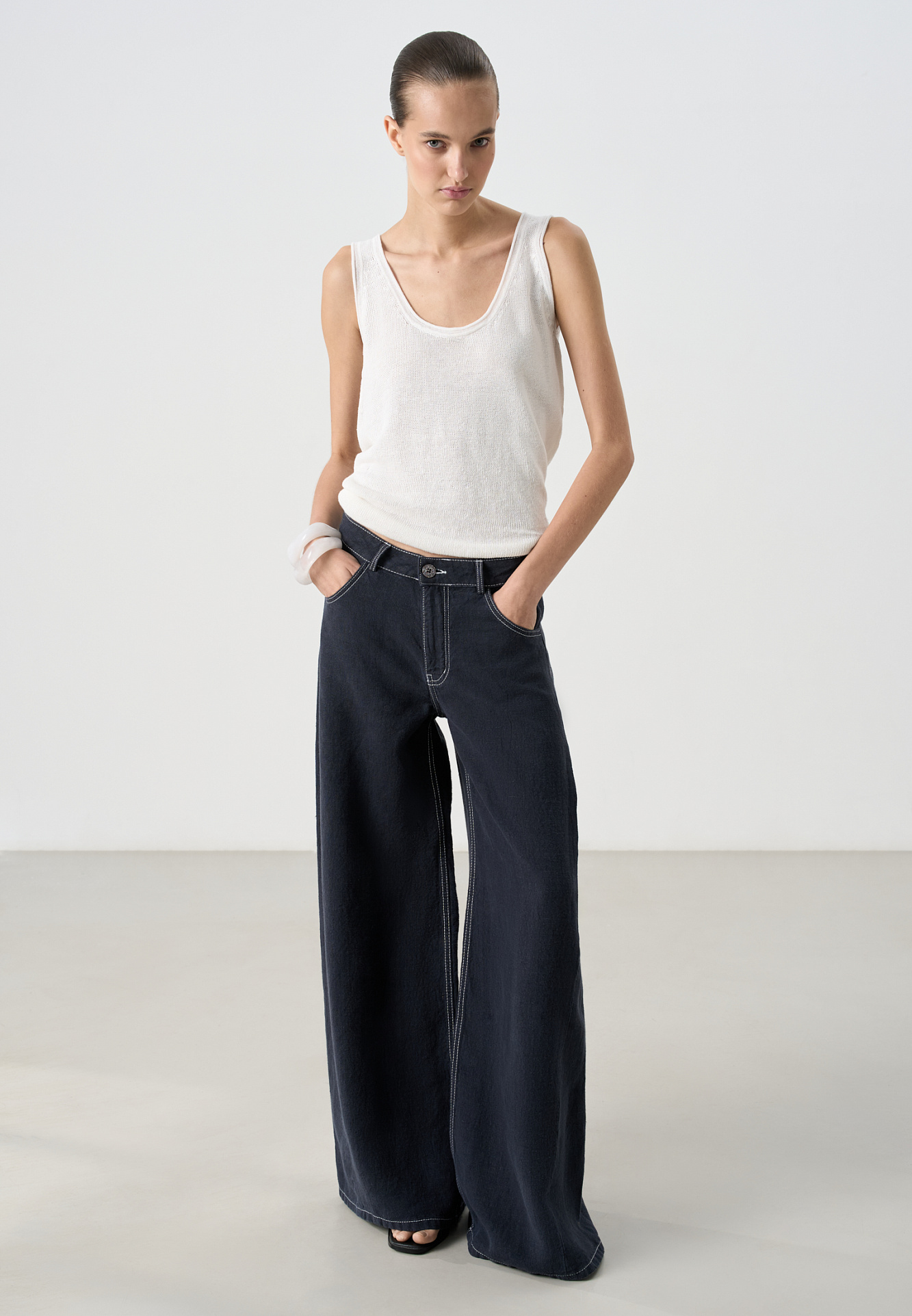 Широкие брюки из 100% льна. Модель прямого кроя, с пятью карманами, шлевками на поясе для ремня и брендированным ярлыком. Изделие декорировано отстрочкой контрастного цвета.