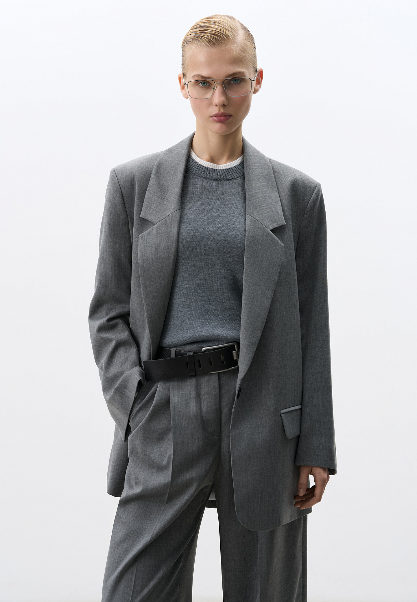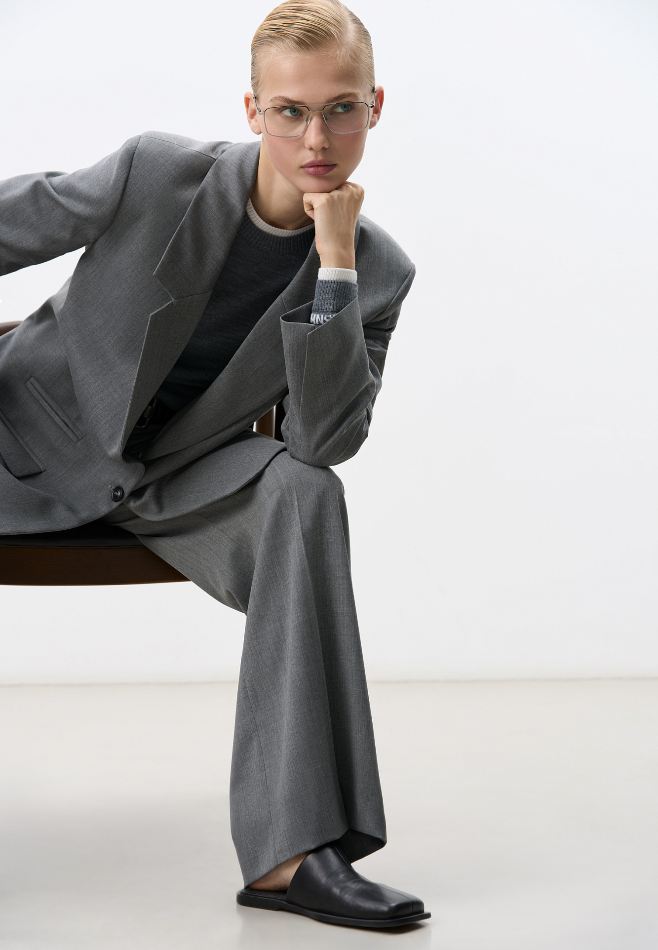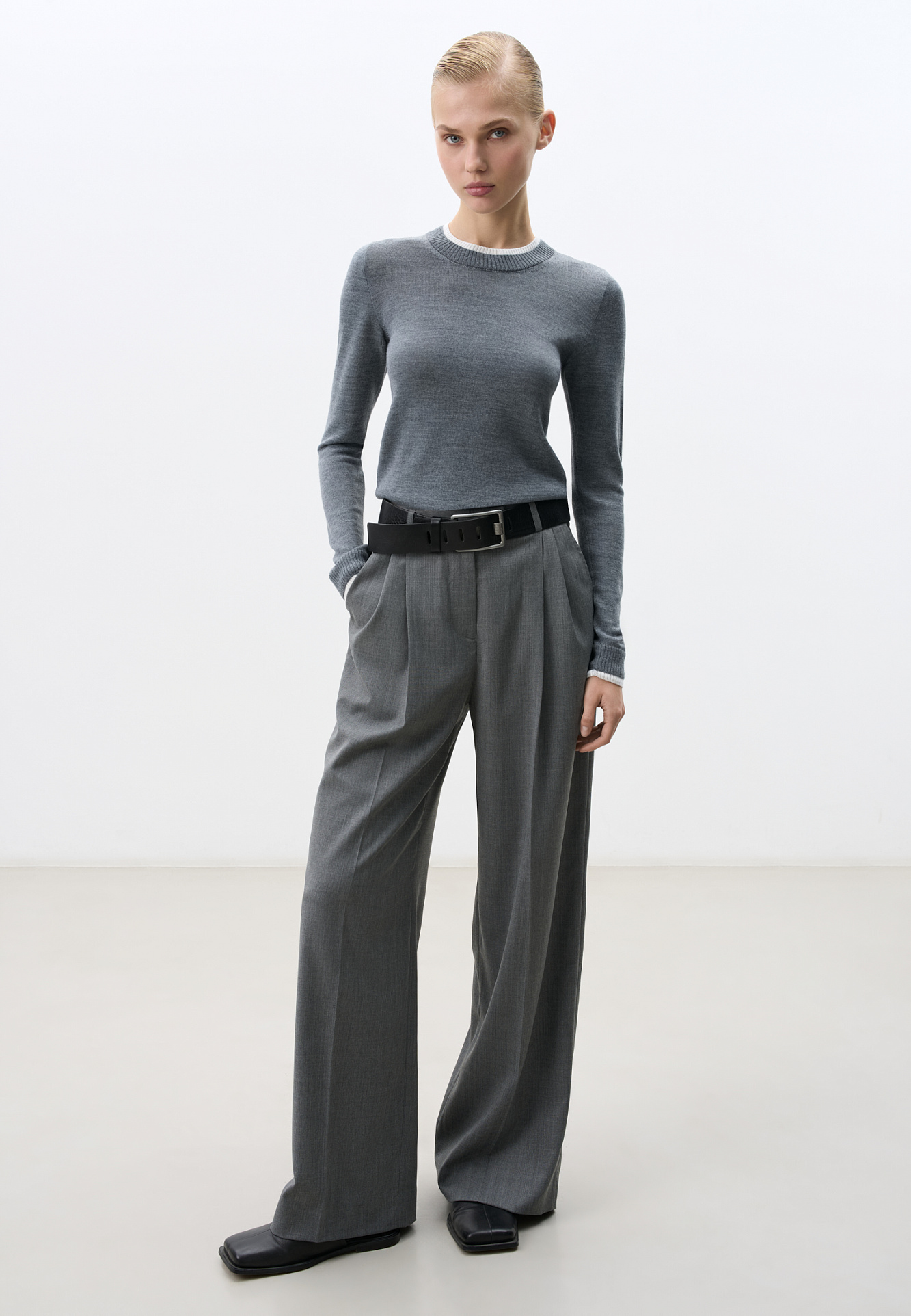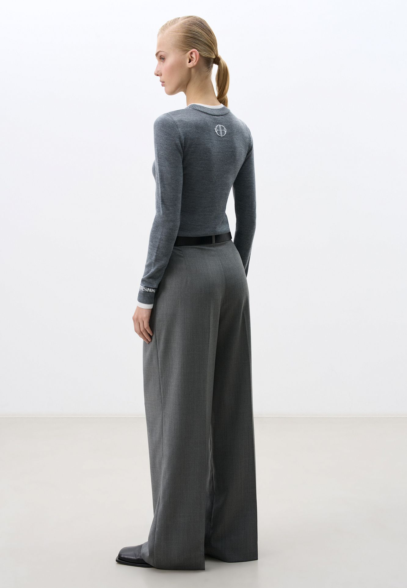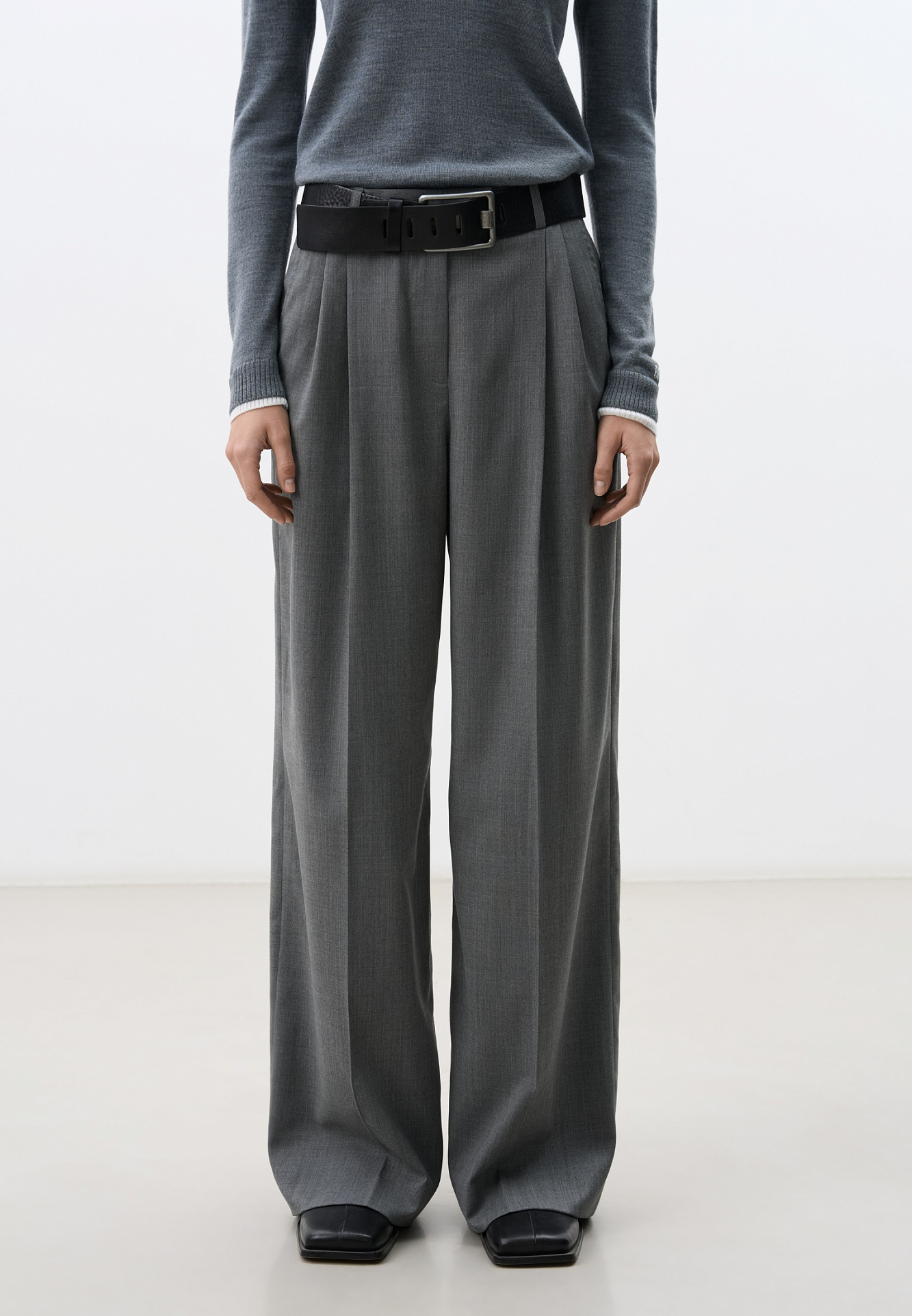 Прямые брюки палаццо из шерсти. Модель свободного силуэта со стрелками, боковыми карманами и застежкой на молнию и крючок.