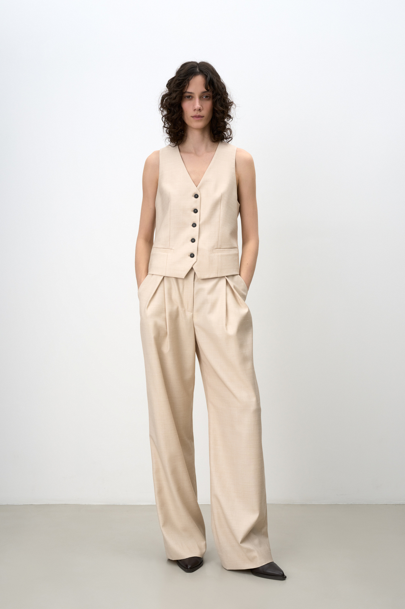 Классические брюки из смесовой шерсти с текстурой. Модель прямого кроя с косыми складками и объемными защипами спереди, шлевками на поясе для ремня и карманами. Застежка на молнию и скрытую пуговицу. Дополнить образ можно жакетом и жилетом в таком же стиле.