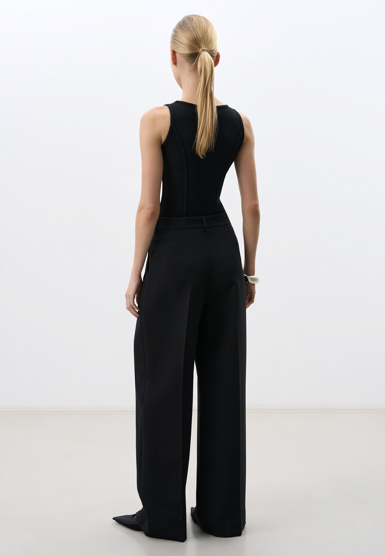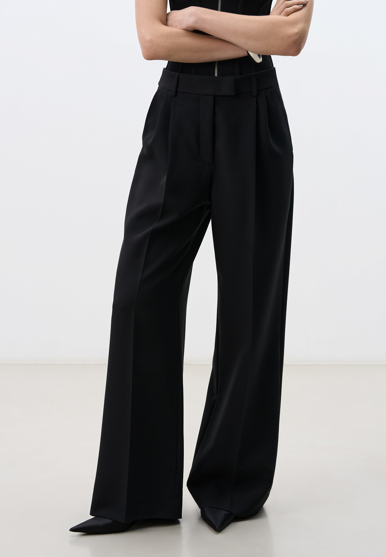 Классические брюки из шерсти. Модель прямого кроя с вытачками и складкой спереди. Шлевки на поясе для ремня, застежка на пуговицу и молнию. Дополнить образ можно жакетом.