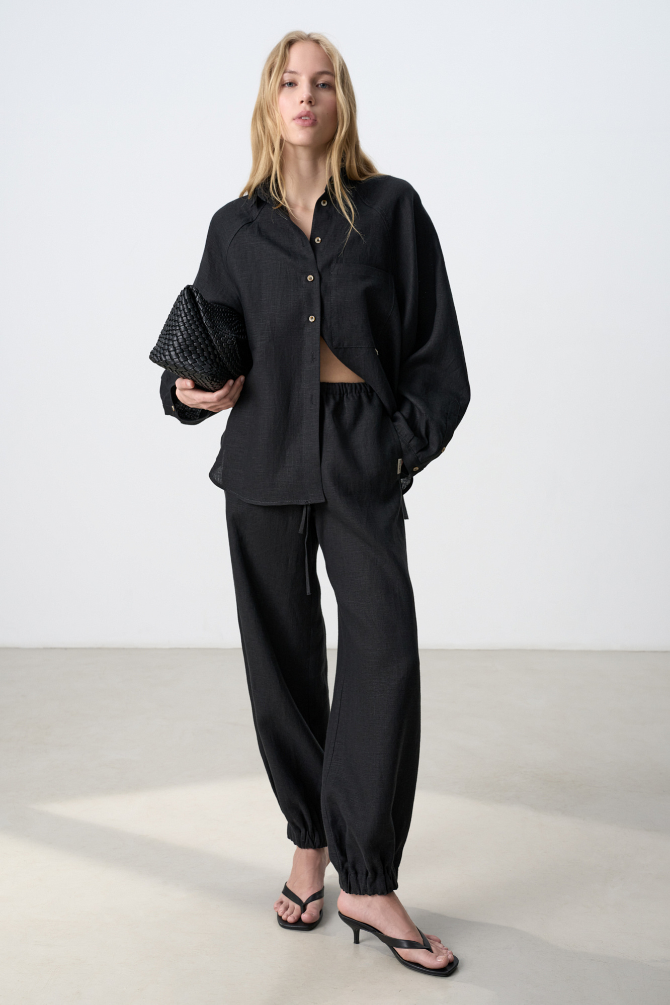 Брюки-джоггеры из 100% льна. Модель свободного силуэта, с эластичным поясом на кулиске и манжетами на резинке.