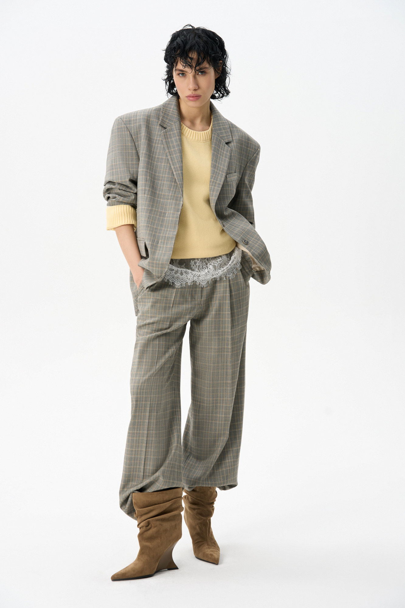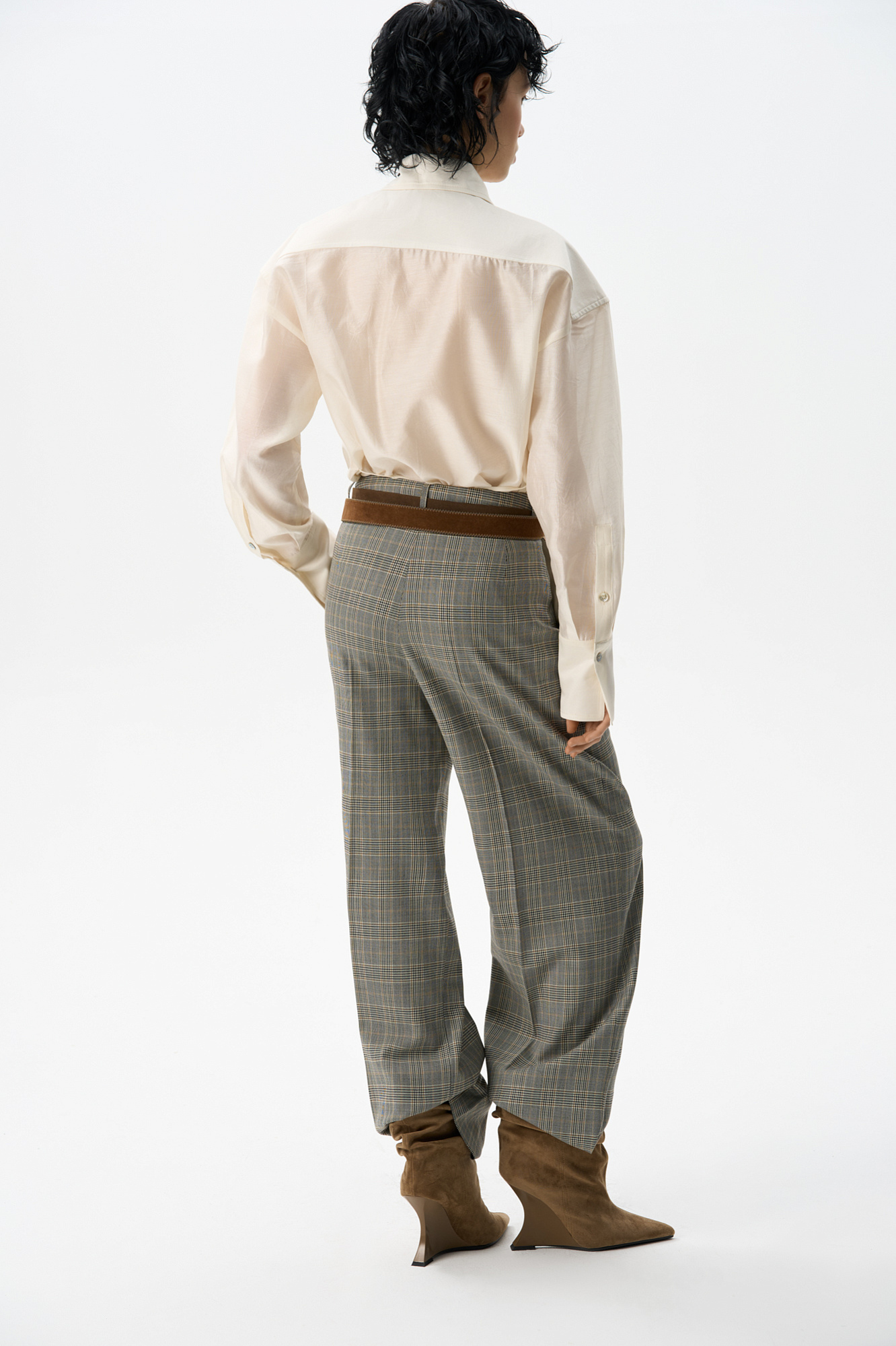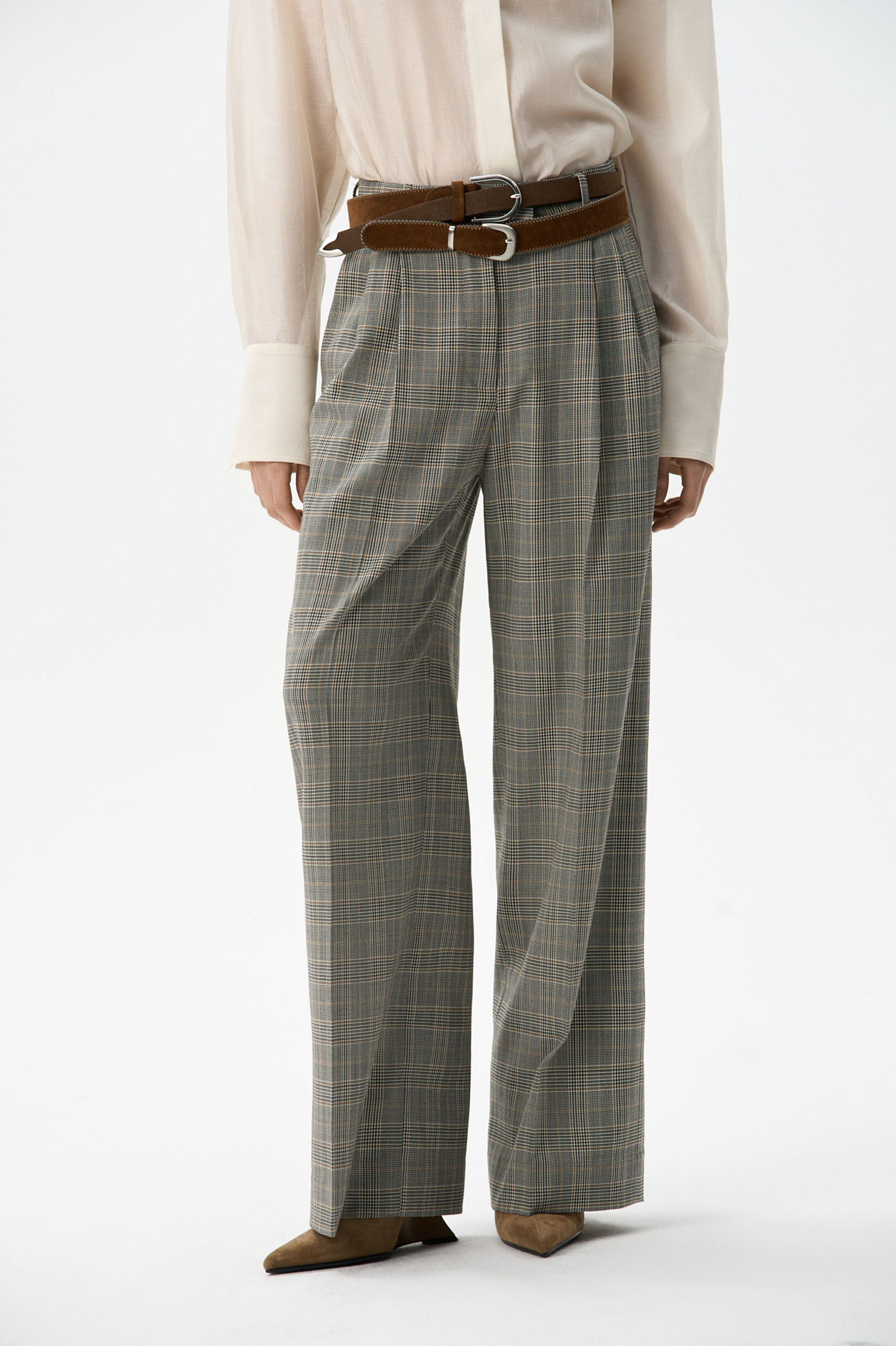 Брюки из шерсти в клетку гленчек. Модель прямого кроя с защипами на талии, шлевками на поясе для ремня и карманами. Застежка на молнию и пуговицу.