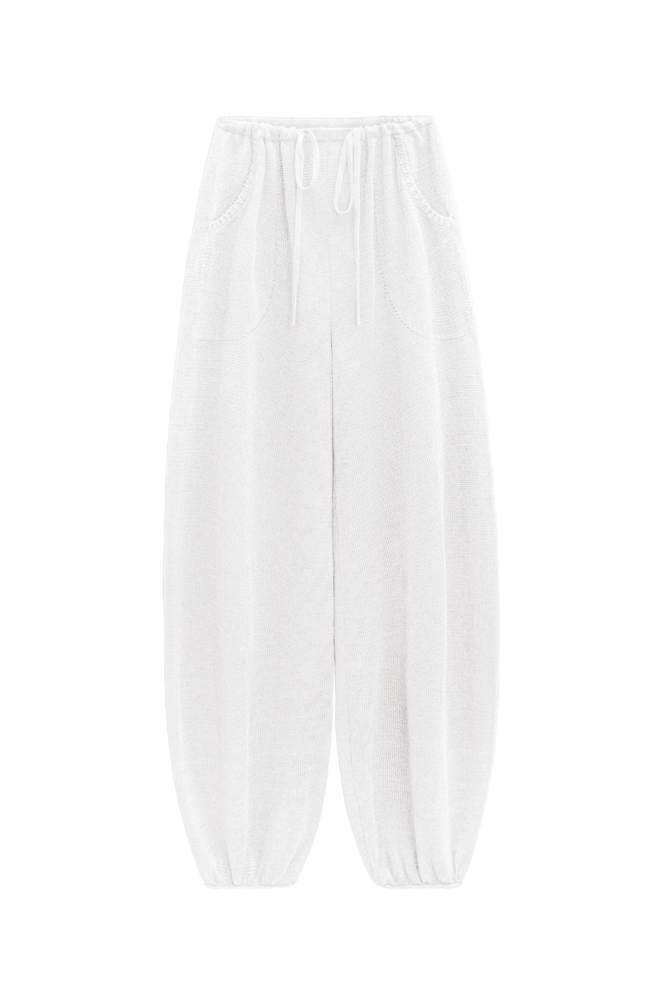 Брюки-алладины из 100% льна. Модель свободного силуэта, с поясом на резинке и двумя карманами.