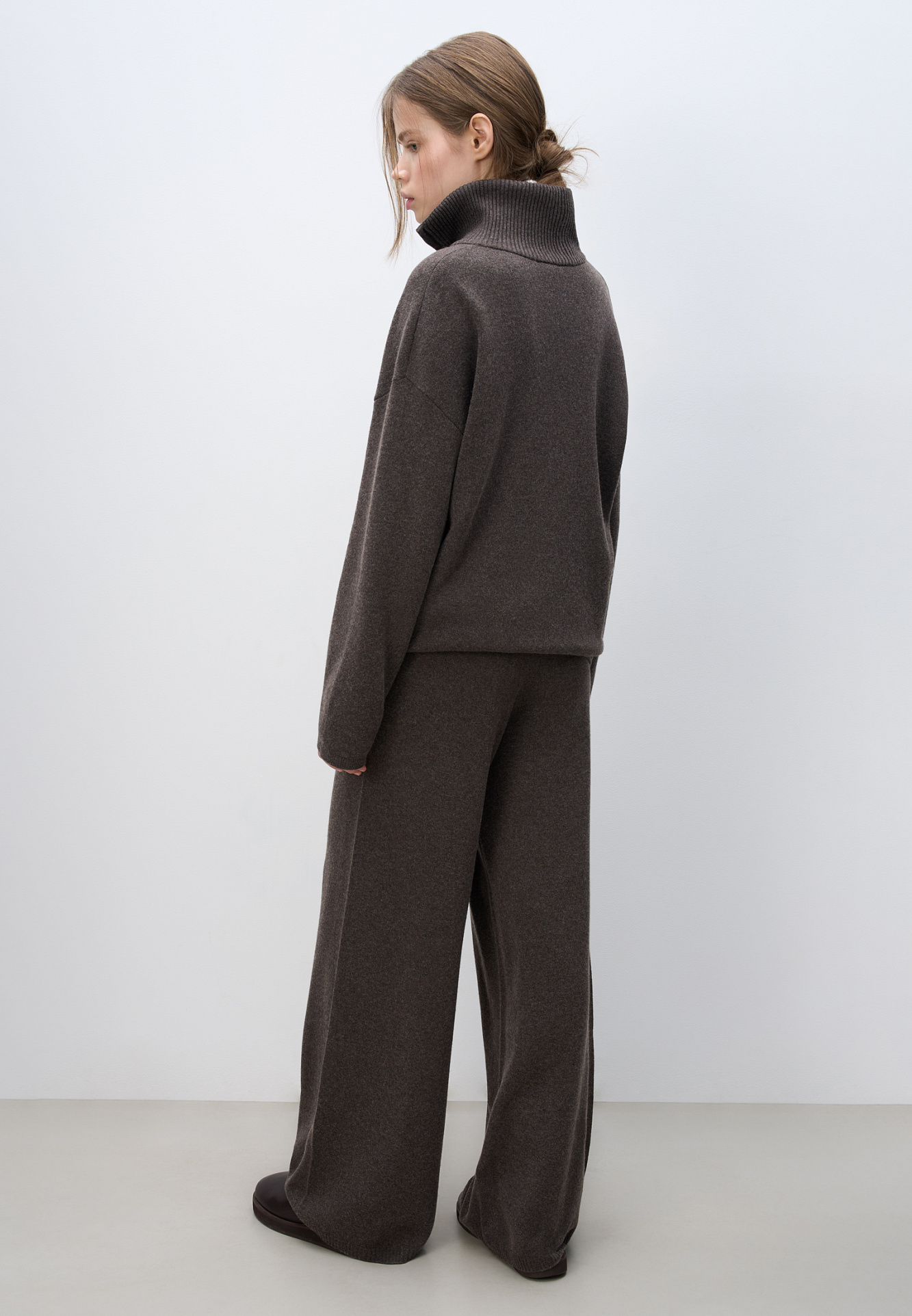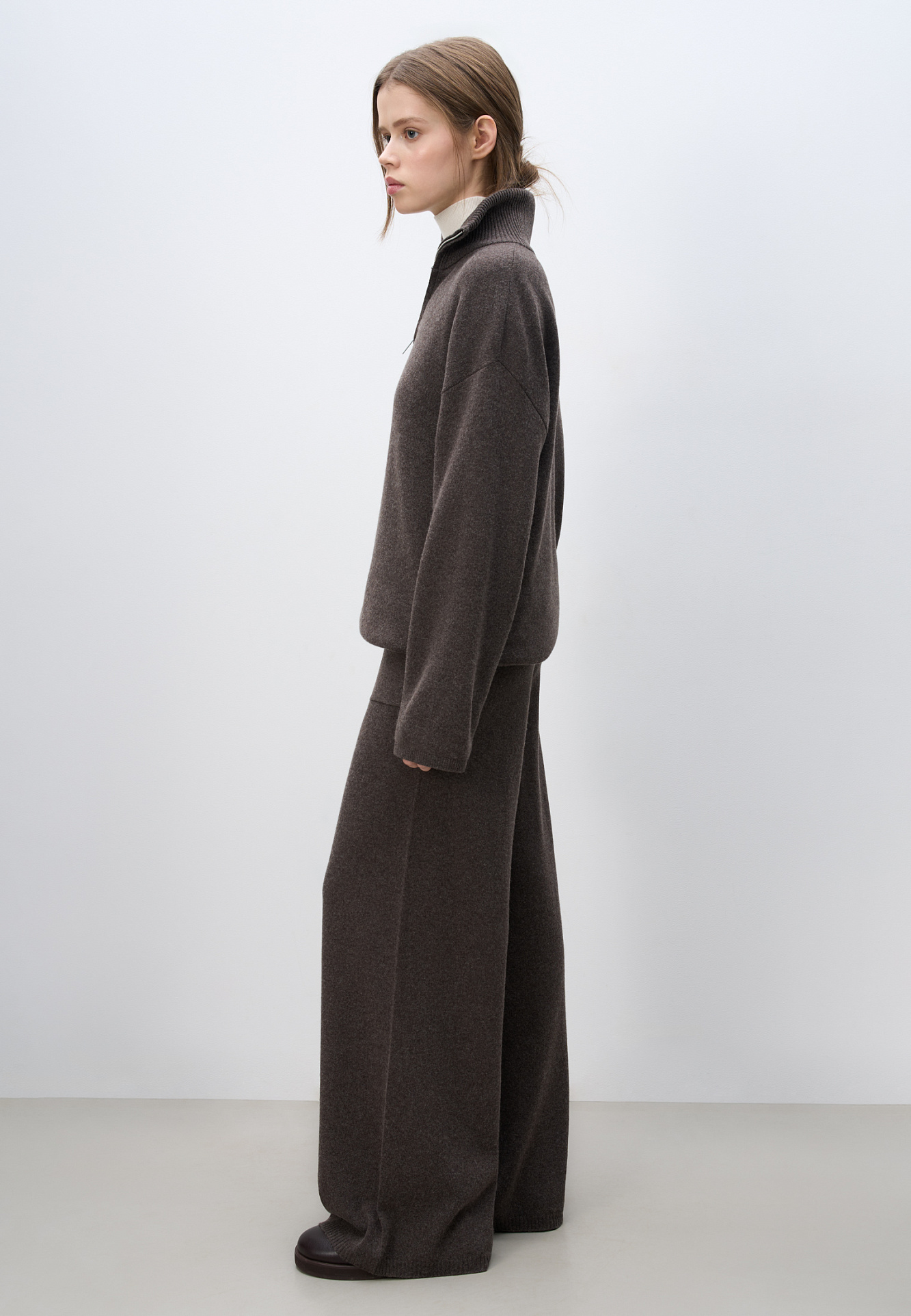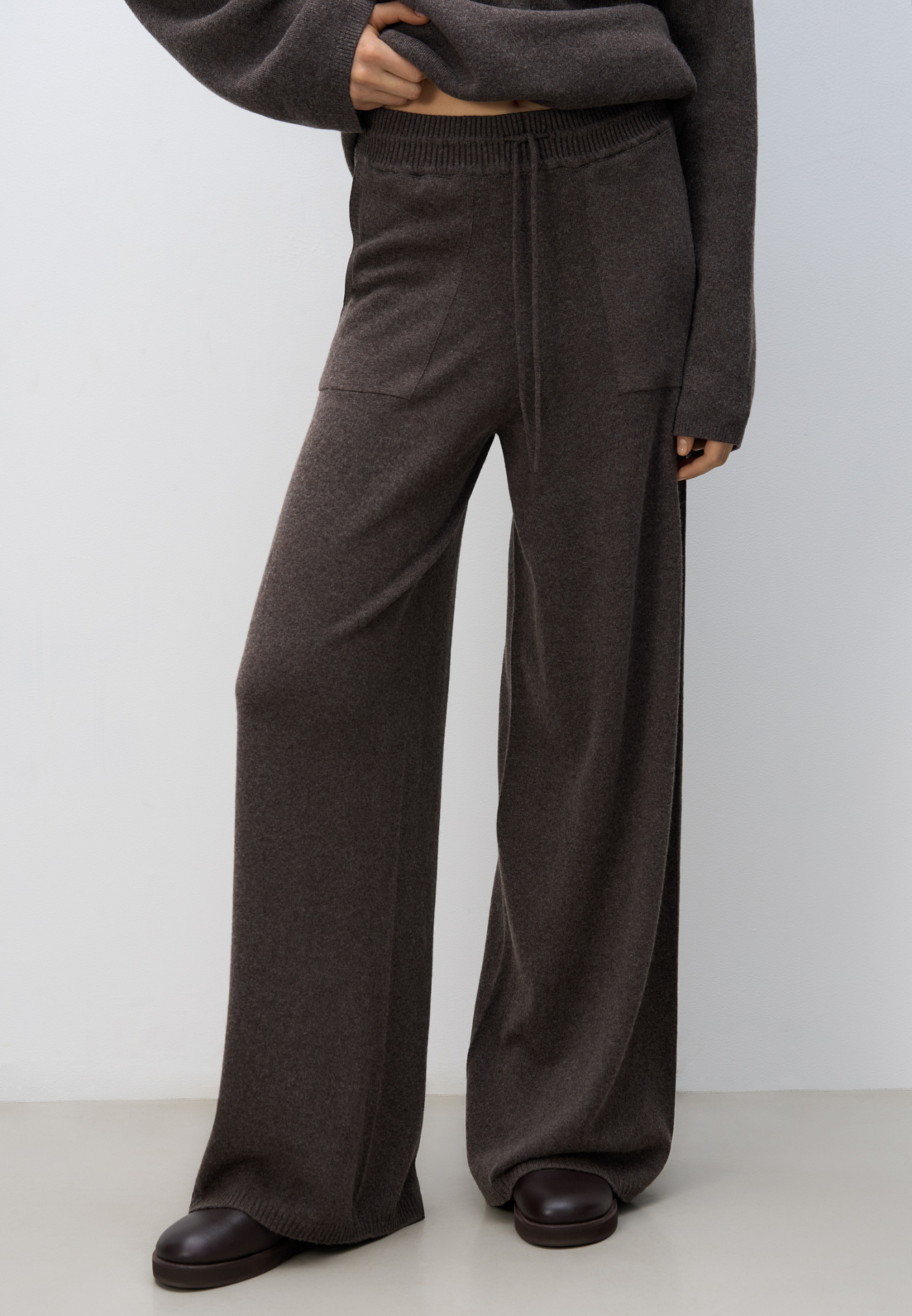 Трикотажные брюки из шерсти с добавлением кашемира. Модель свободного силуэта с эластичным поясом на кулиске и боковыми карманами. Манжеты брюк выполнены в рубчик.