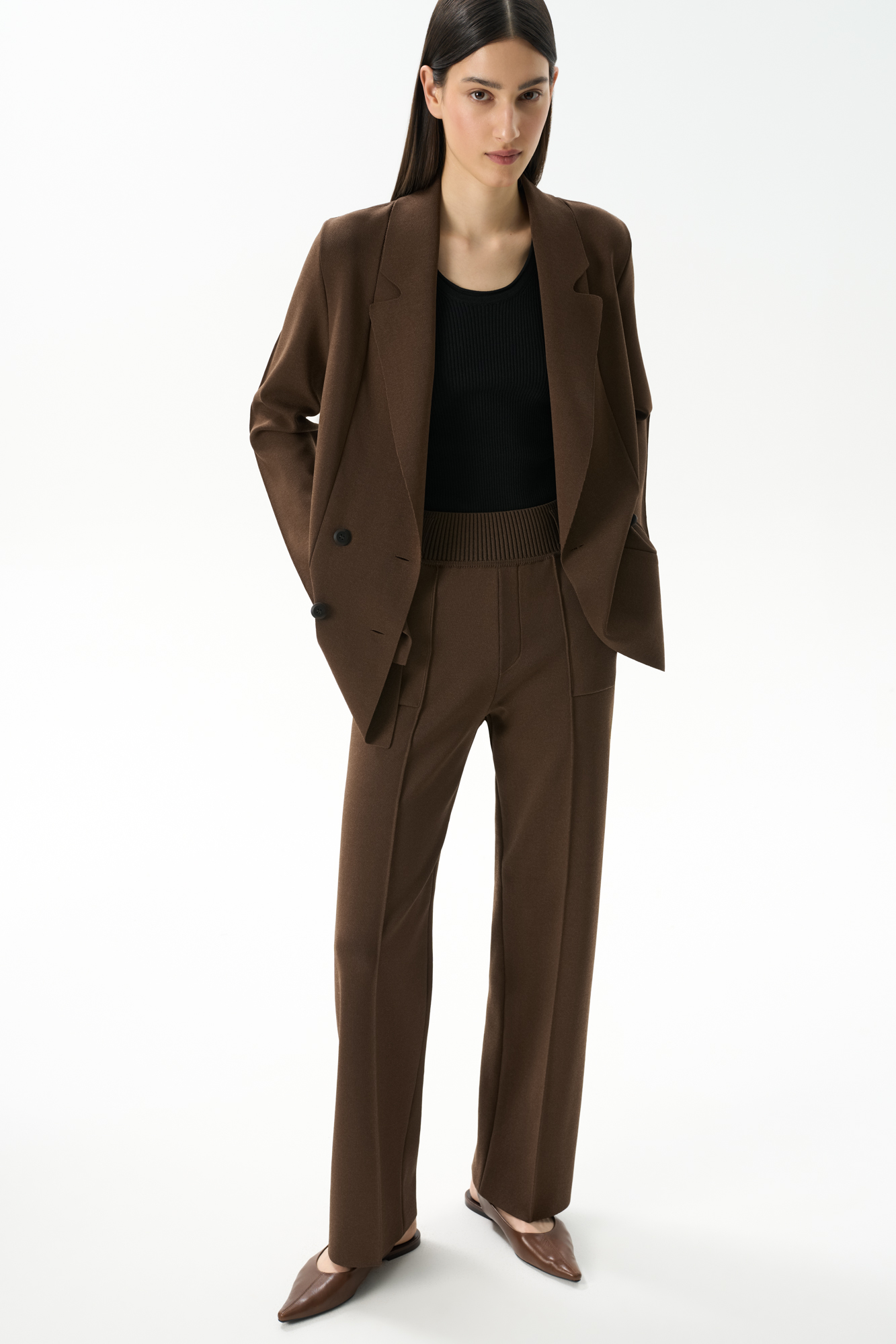 Классические брюки прямого кроя из вискозы со стрелками и поясом-резинкой со шлевками. Для создания комплекта сочетайте их с двубортным жакетом в тон.