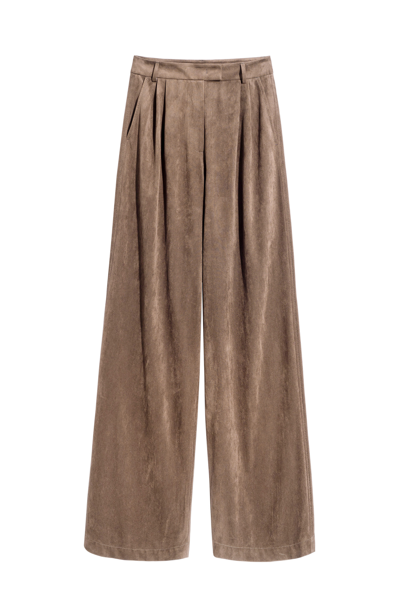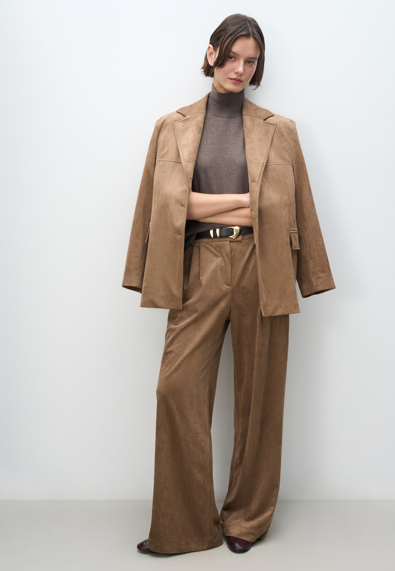 Брюки из ткани с имитацией внешнего вида и свойств натуральной замши. Модель с защипами на талии, шлевками на поясе для ремня. Застежка на скрытую пуговицу и брючный крючок. Отделка строчкой в тон.
