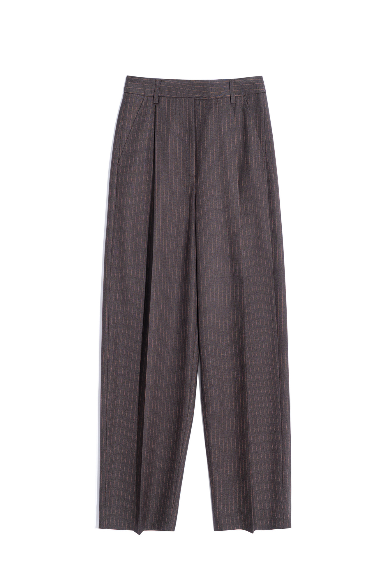 Прямые брюки из вискозы в полоску. Модель со шлевками для ремня и врезными карманами. Застежка на молнию, брючный крючок и скрытую пуговицу.