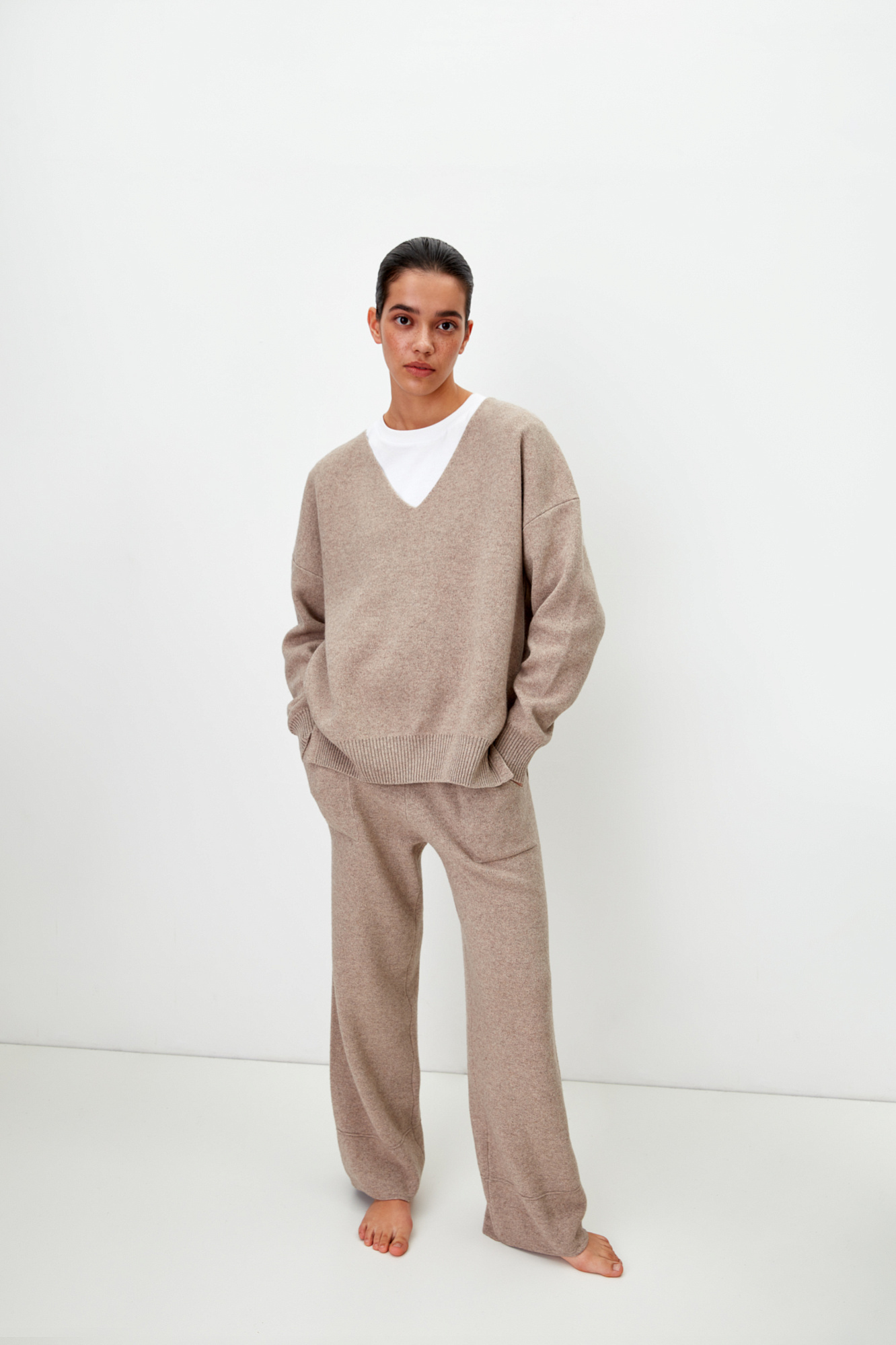Брюки из кашемира и шерсти средней посадки, с карманами, широкий пояс-резинка. Шлевки под ремень.
