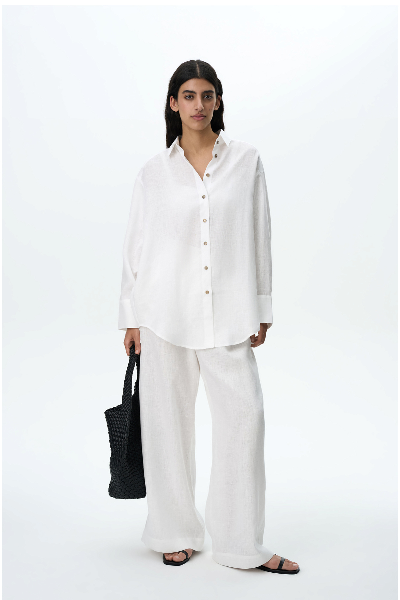 Брюки из 100% льна. Модель прямого кроя, с высокой посадкой, косой застежкой на пуговицу и молнию, боковыми карманами.