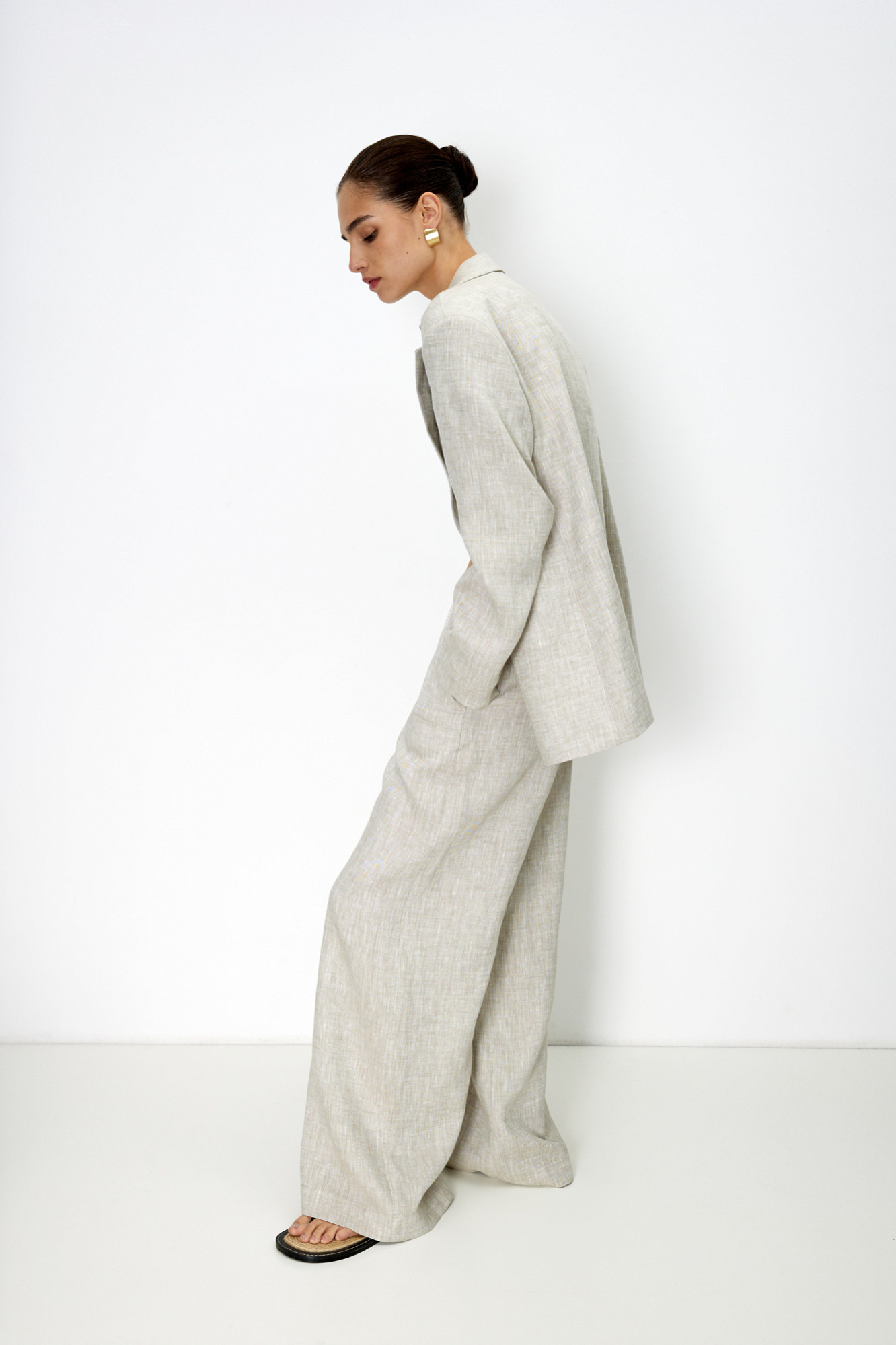 Широкие льняные брюки. Модель прямого силуэта с боковыми карманами и эластичным поясом на резинке с кулиской.