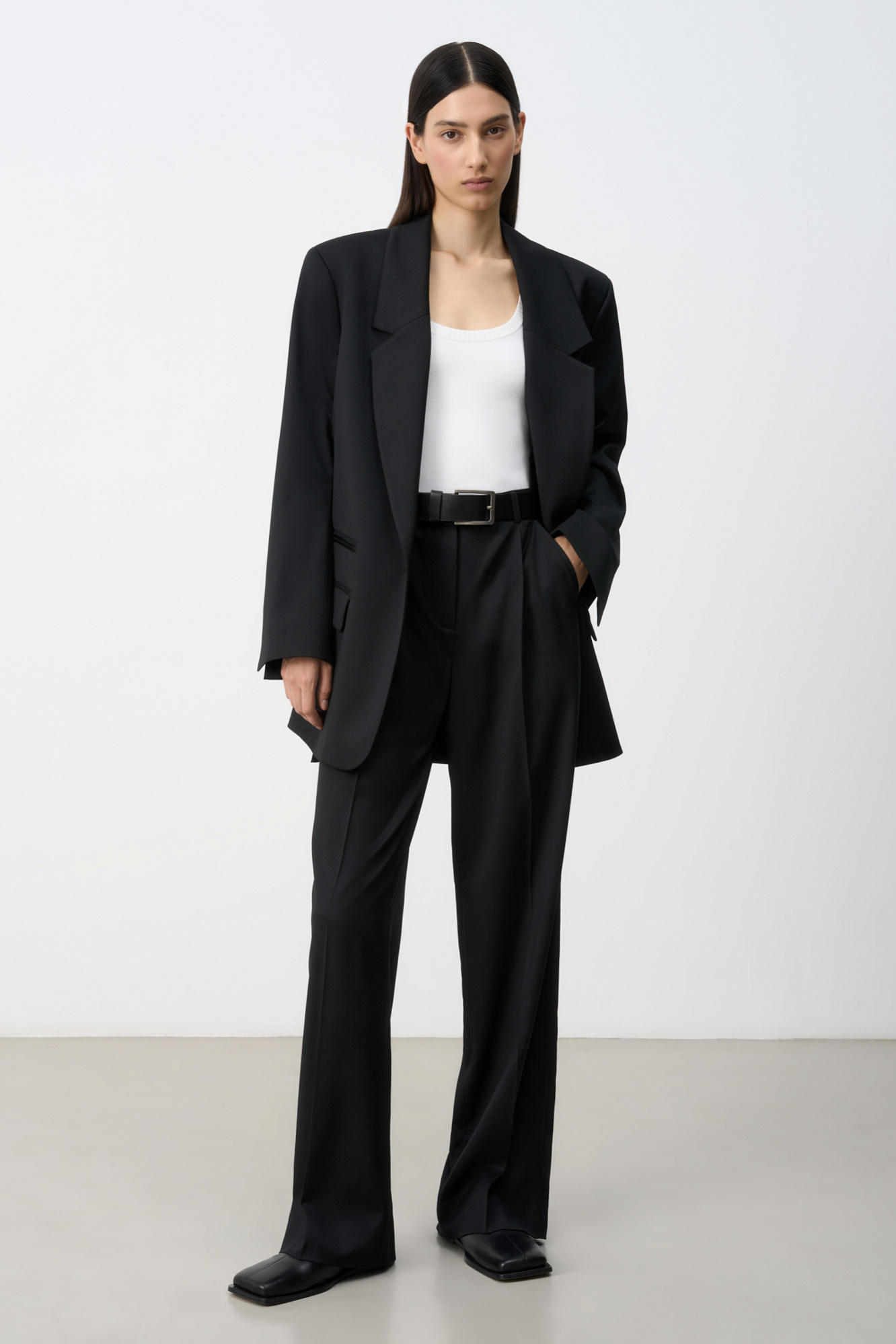 Брюки прямого кроя с защипами на талии. Боковые карманы и прорезной карман сзади. Застежка на молнию, крючок и внутреннюю пуговицу.