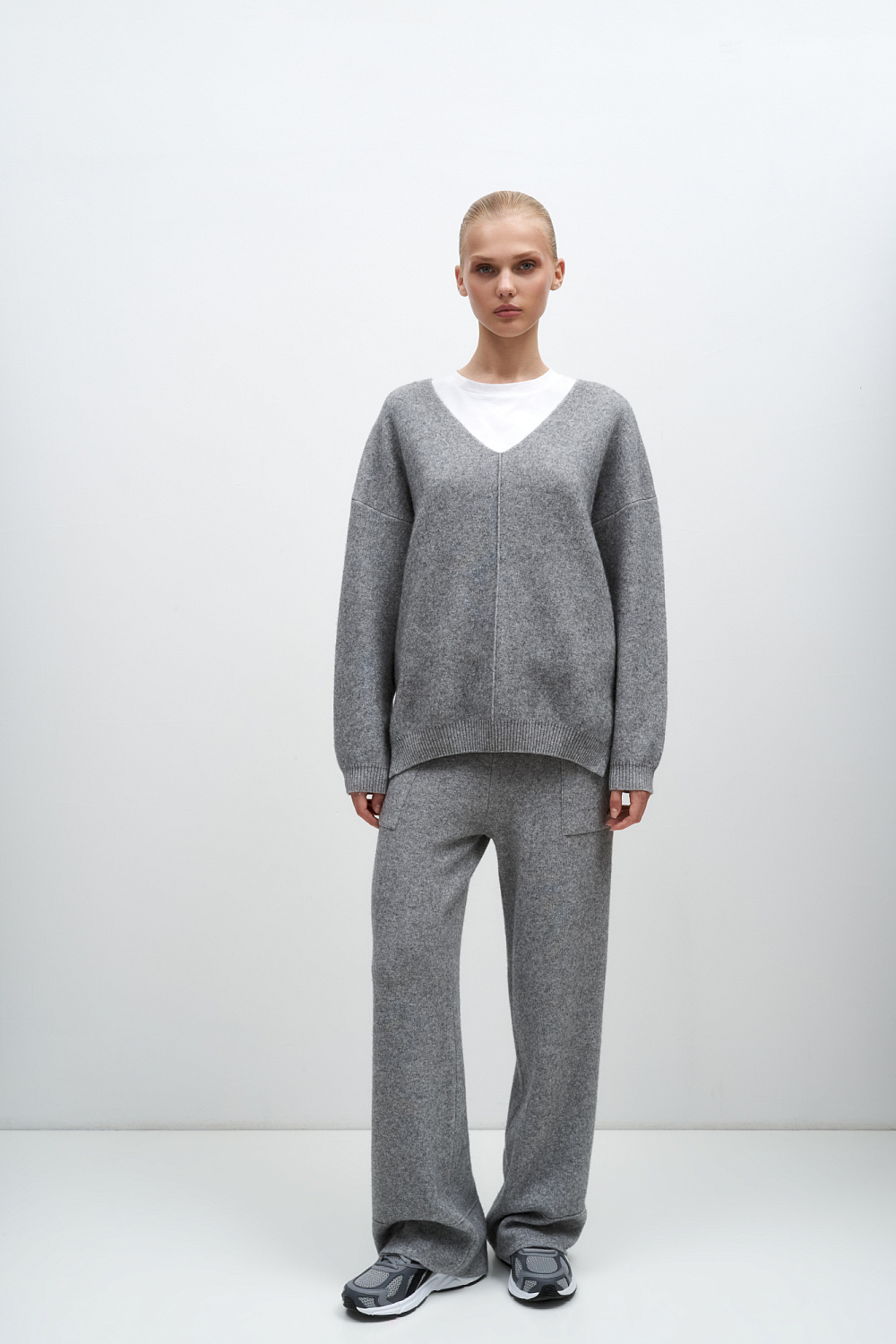 Прямые трикотажные брюки из смесовой шерсти с добавлением кашемира. Модель с накладными карманами и эластичным поясом в рубчик.