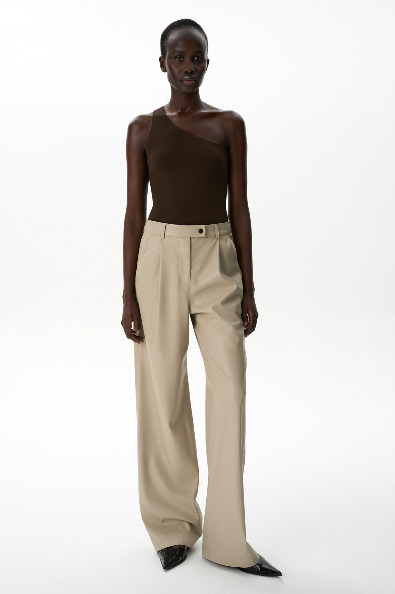 Прямые брюки из экокожи свободного силуэта со средней посадкой и боковыми карманами. Застежка на потайную молнию и кнопку. Паты на поясе для ремня.