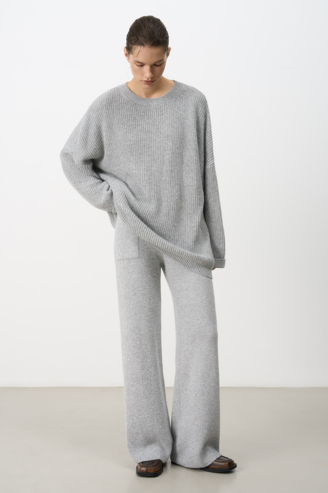 Трикотажные брюки из смесовой шерсти. Модель свободного кроя со средней посадкой, боковыми карманами и эластичным поясом в рубчик.