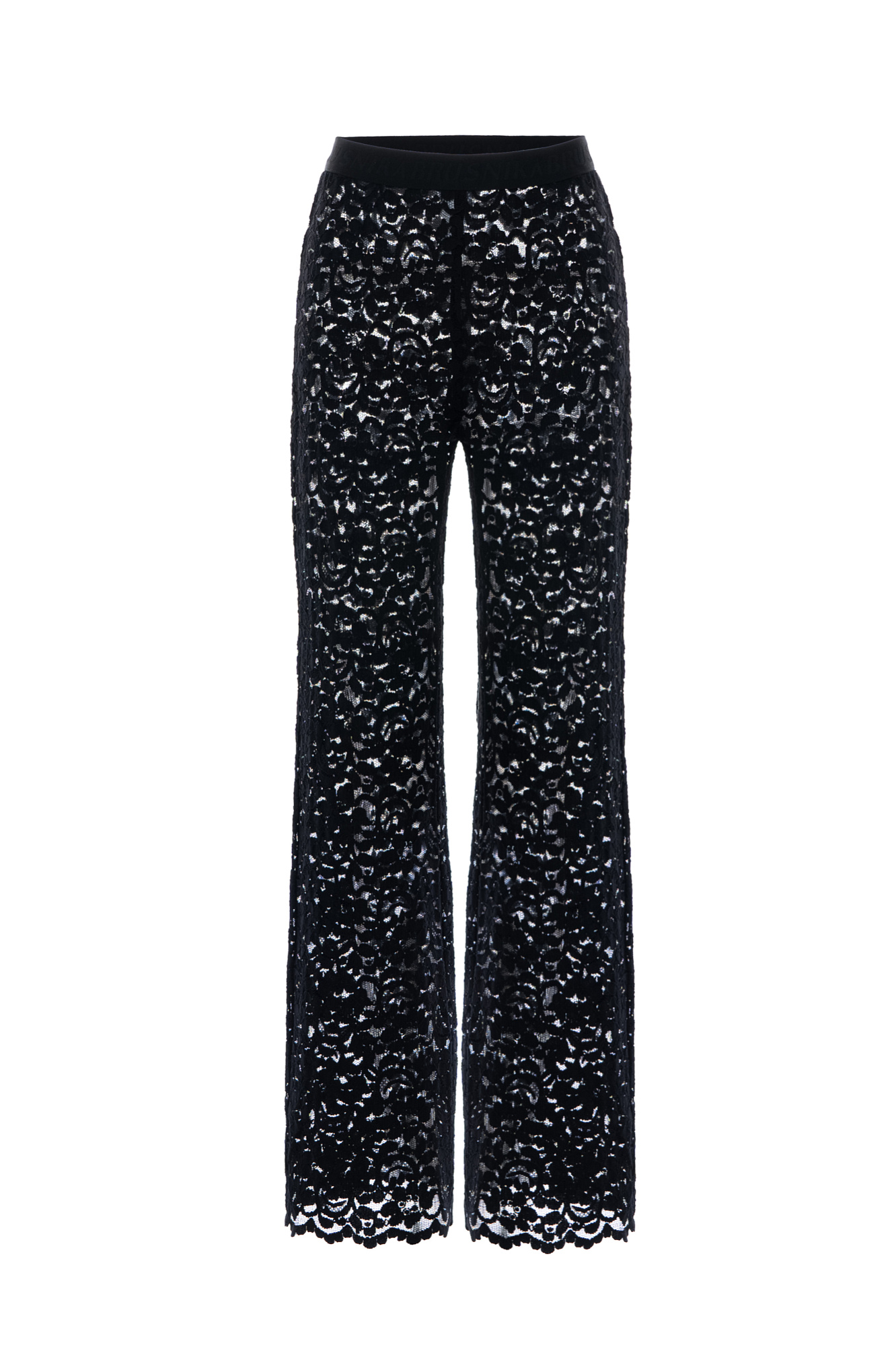 Полупрозрачные расклешенные брюки с брендированным эластичным поясом на резинке и молнией сзади. Выполнены из итальянского кружева. Образ можно дополнить кружевным укороченным топом с длинными рукавами.